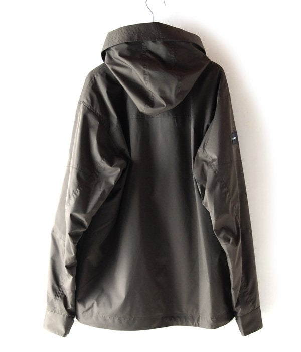ストレッチの利いたツイル地を直線的に切り替えたシェルジャケット。頭をスッポリ覆うフードのバイザーをステッチで補強。鋭角的なバストポケットに加えて、左袖にジップポケット付き。