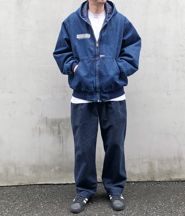DESCENDANTから、GRAZE DENIM JACKETが入荷しました。コットンデニムを使用したDWUシリーズのフードジャケット。14ozと厚手の生地を使用し、裏地にキルティングを配した防寒性の高い1着。袖口と裾にリブを設け、マフポケットを配置したデザイン。胸元のデザインパッチと刺繍に込められたメッセージ性の高いアクセント。