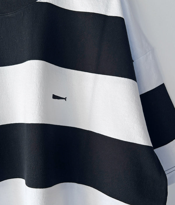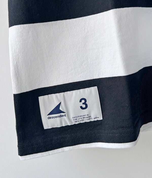 DESCENDANTから、白ボディにNAVY・BLACKの均等ボーダーをデザインした2カラー展開のボーダーTシャツです。左胸の白地の部分にCACHALOTの刺繍をワンポイント、ネックの継ぎ目にはブランドネーム入りのオリジナルパイピングテープ付き。
