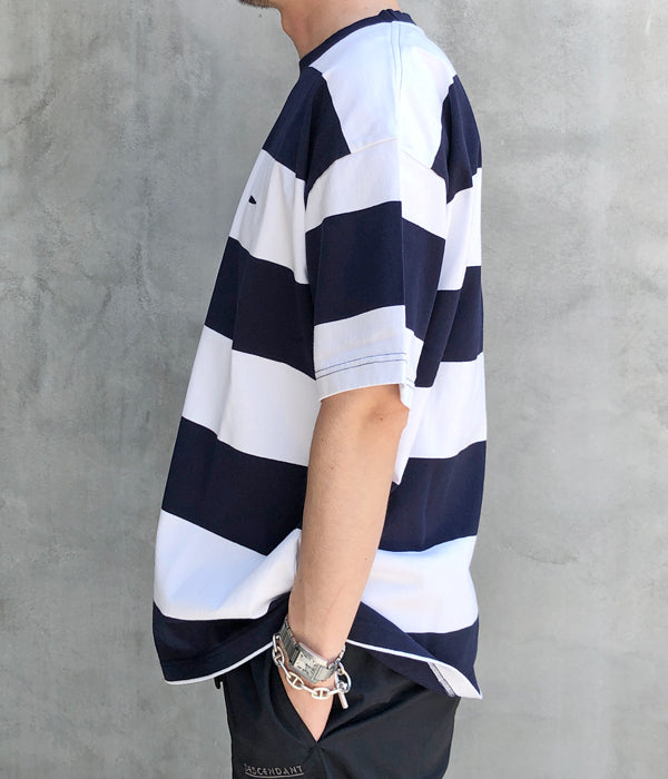 DESCENDANTから、白ボディにNAVY・BLACKの均等ボーダーをデザインした2カラー展開のボーダーTシャツです。左胸の白地の部分にCACHALOTの刺繍をワンポイント、ネックの継ぎ目にはブランドネーム入りのオリジナルパイピングテープ付き。