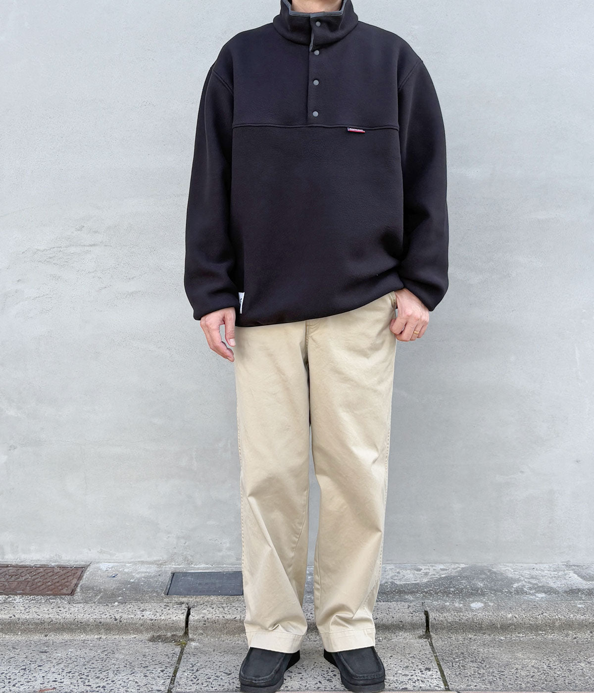 DESCENDANTから、HUMMING FLEECE PULLOVERが入荷しました。肉厚なヘビーフリース素材を使用したスナップボタン式スタンドカラープルオーバー。ゆったりとした身幅を上下に切り替え、胸元にHORIZONのロゴパッチをであしらいました。スタンドカラーの背面部分のHORIZONの刺繍パッチと、配色を切り替えたパイピング処理がポイント。
