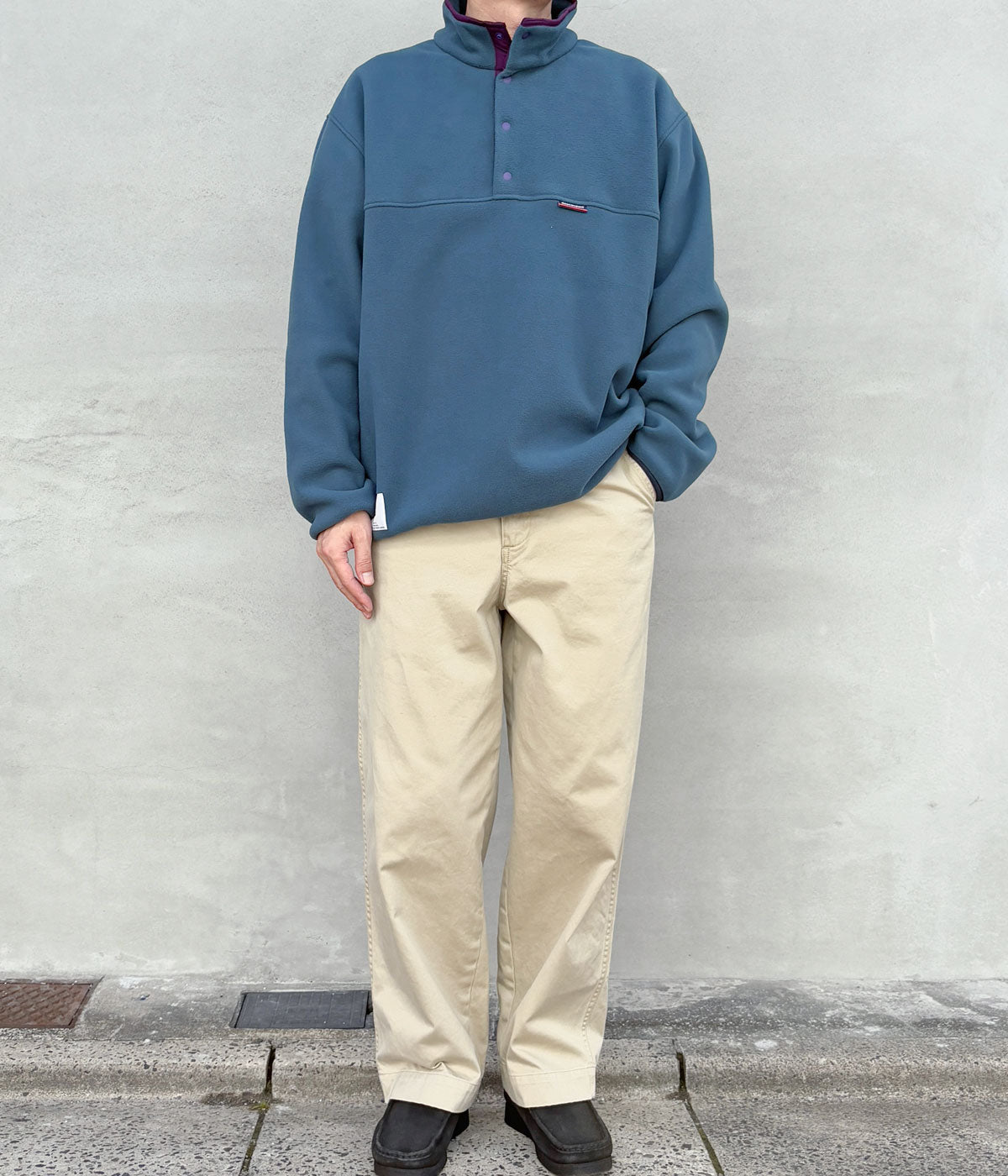 DESCENDANTから、HUMMING FLEECE PULLOVERが入荷しました。肉厚なヘビーフリース素材を使用したスナップボタン式スタンドカラープルオーバー。ゆったりとした身幅を上下に切り替え、胸元にHORIZONのロゴパッチをであしらいました。スタンドカラーの背面部分のHORIZONの刺繍パッチと、配色を切り替えたパイピング処理がポイント。