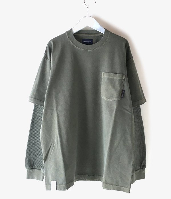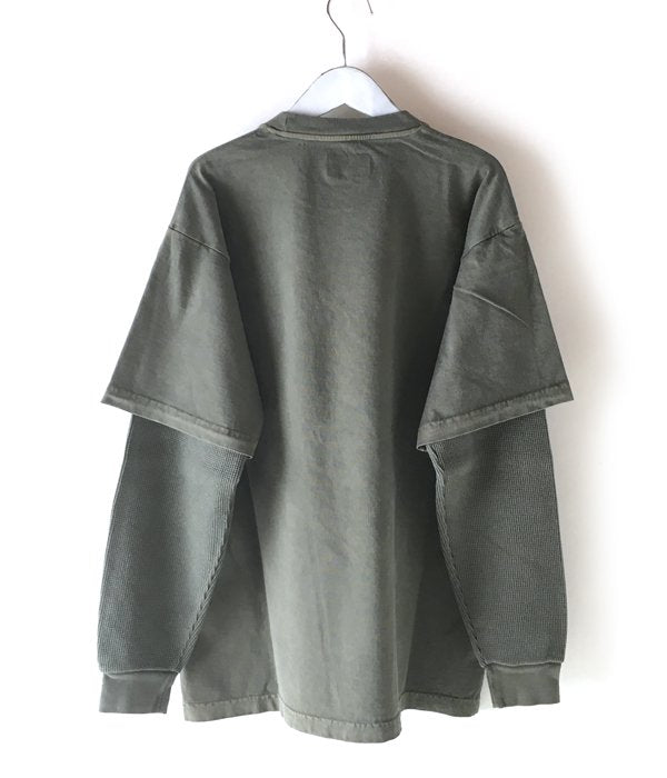 DESCENDANTから、MILITIA LAYERD TEEが入荷しました。ピグメントダイ加工を施したコットン天竺ボディに、ワッフル編のロングスリーブをドッキングした定番のレイヤードカットソー。季節の変わり目に重宝する一着です。ポケット脇にはHORIZON LOGOをON。