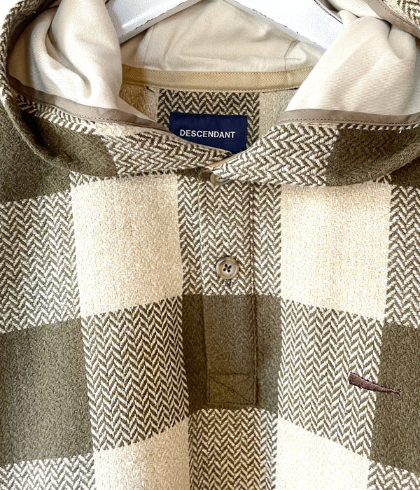 DESCENDANTから、MOLE HOODED LS SHIRT FULL SIZEが入荷しました。ヘリンボーン織りの使用したブロックチェック柄プルオーバーフードシャツ。ボタン2か所のハーフプラケットに、サイドポケットの仕様。裾周りにはドローコードを仕込んだお馴染みのモデル。