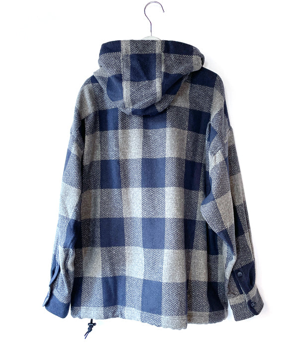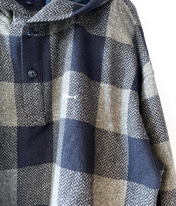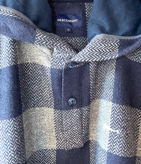 DESCENDANTから、MOLE HOODED LS SHIRT FULL SIZEが入荷しました。ヘリンボーン織りの使用したブロックチェック柄プルオーバーフードシャツ。ボタン2か所のハーフプラケットに、サイドポケットの仕様。裾周りにはドローコードを仕込んだお馴染みのモデル。