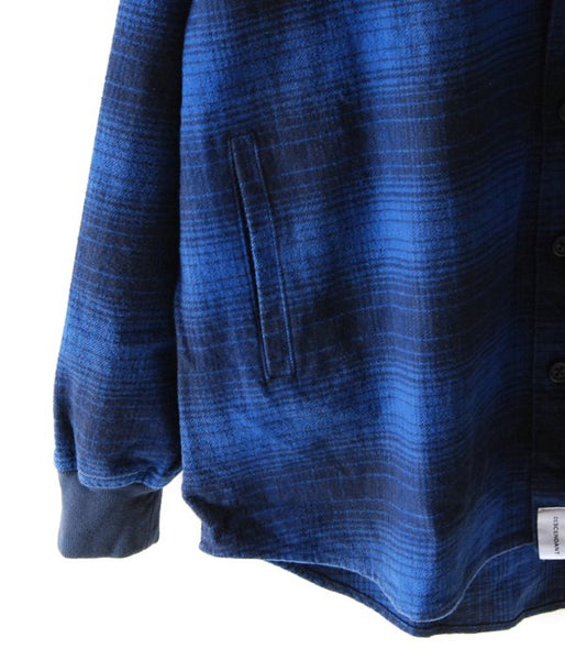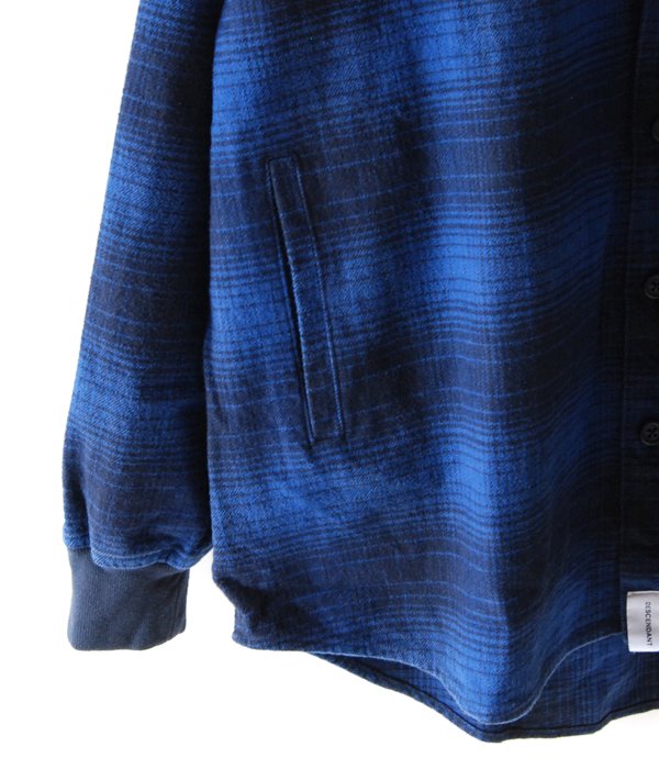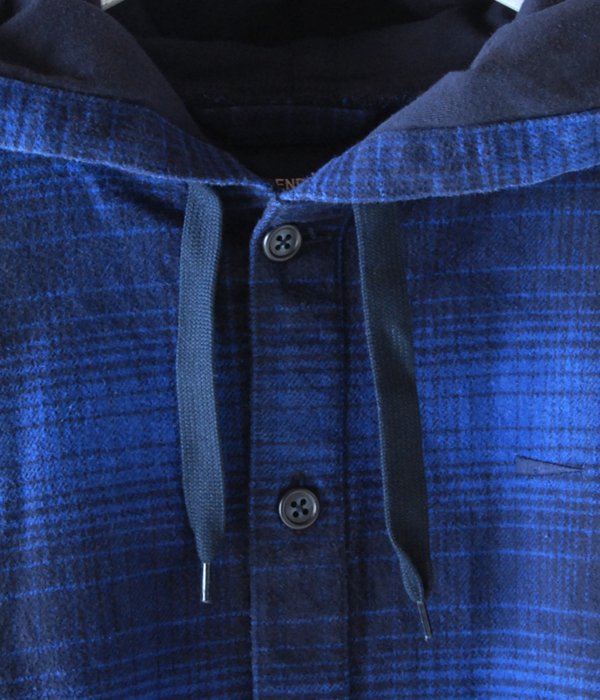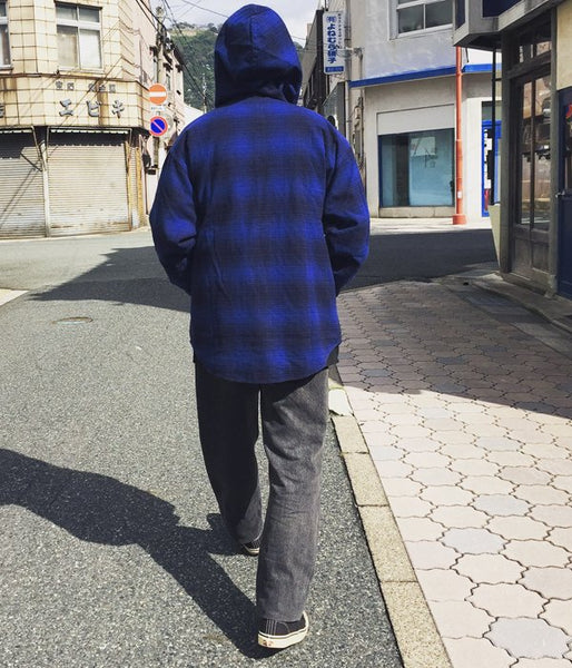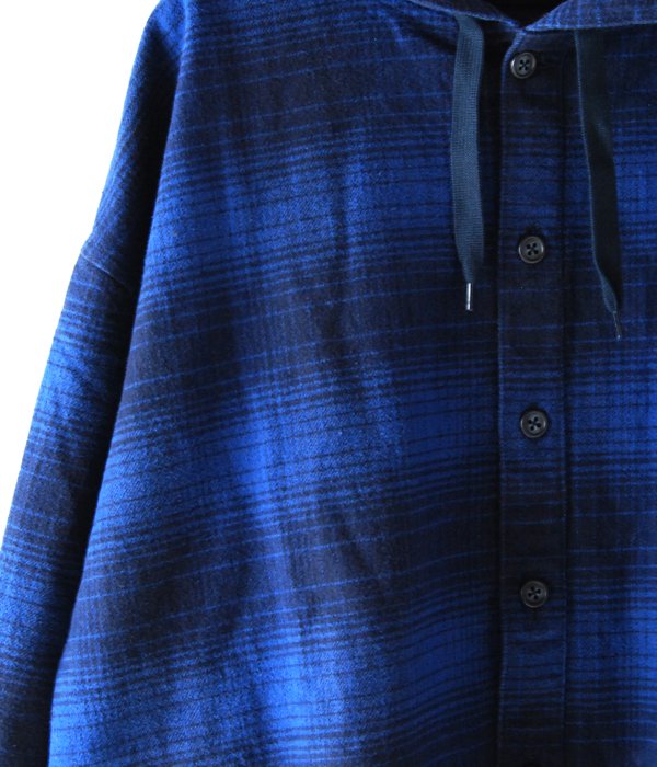 オンブレチェックのコットンヘヴィツイルを使用したフーデッドシャツ。前身頃の左胸にクジラの刺繍を施し、左右にサイドポケット付き。袖口をニットリブでアレンジ。
