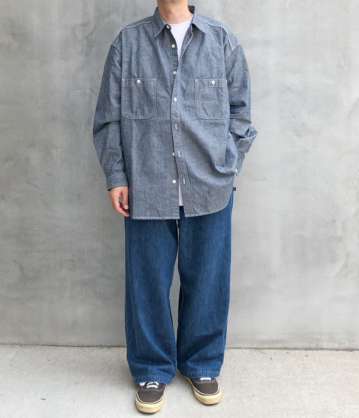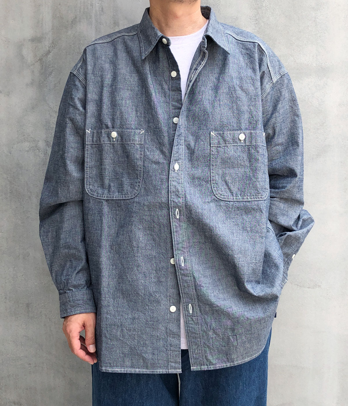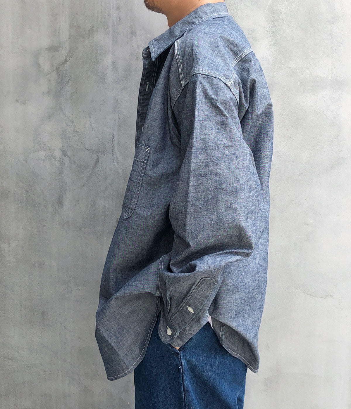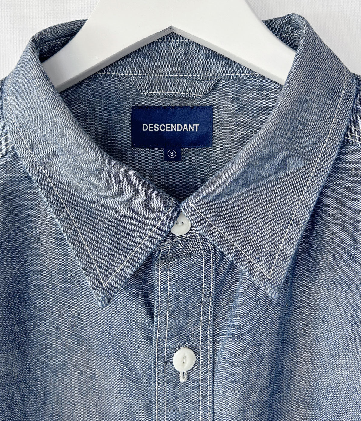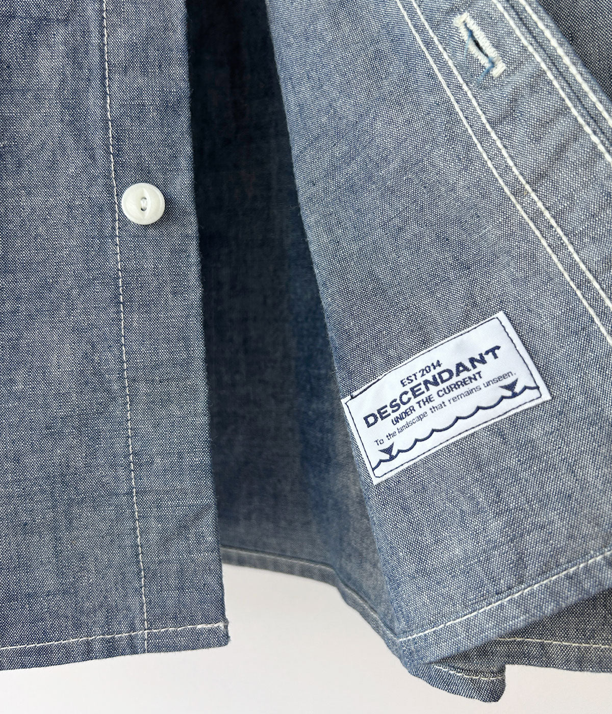 DESCENDANTから、NORMAN CHAMBRAY LS SHIRTが入荷しました。9ozのコットンシャンブレー素材を使用したワークテイストのシャツ。要所のトリプルステッチによる仕上げがワーク感を演出します。ハリのあるムラ糸を使用した素材感に、左右のボタン留めのパッチポケットがポイント。