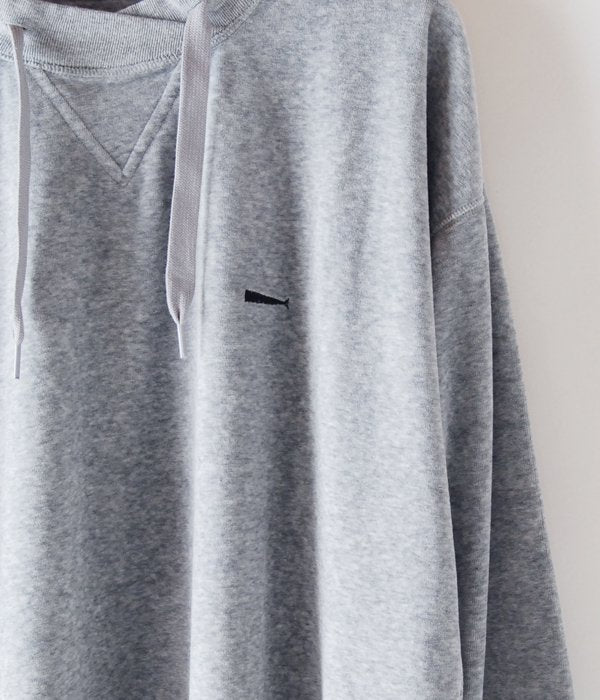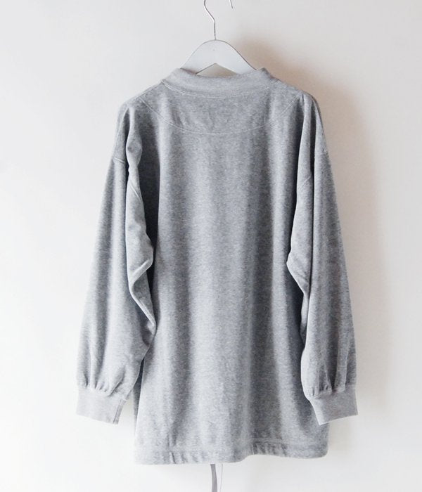ポリエステル混の光沢感のあるコットンベロアで仕立てたカットソー。前合わせの襟回りと裾回りに通したスピンドルでシルエットも調整可。クジラの刺繍ロゴのワンポイント。