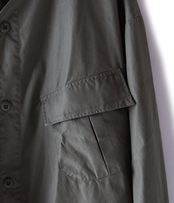 薄手のコットン生地を使用したノーカラーシャツ。前下がりの襟に合わせた前裾のカッタウェイ仕様。左胸に斜めに配置したフラップポケットがアクセント。