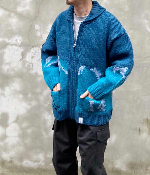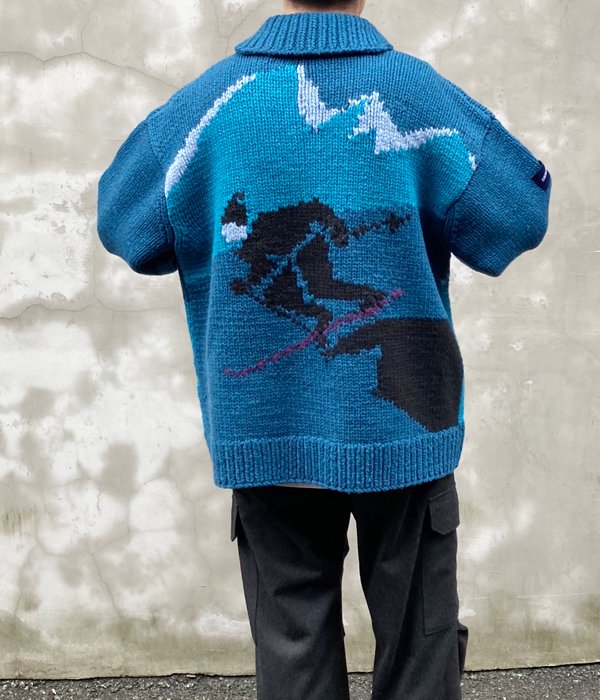 DESCENDANTから、SKI COWICHAN KNITが入荷しました。雪山のスキーヤーをラムズウールのローゲージ編みでデザインしたカウチンニット。ショールカラーにフロントはジップ開閉式、左右にポケットを携えました。バックスタイルの滑走するスキーヤーがインパクトを与えます。