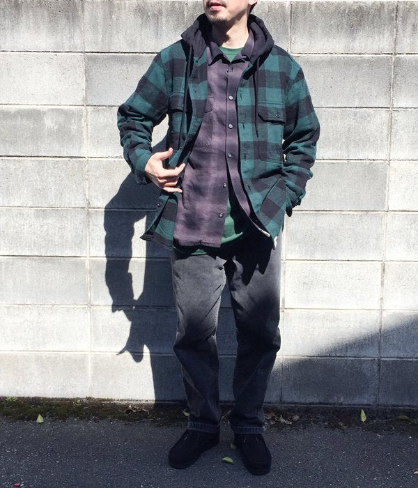 バッファローチェックのフランネルシャツとスウェットフーディーをドッキング。ボックスシルエットにダブルフラップポケットの仕様。