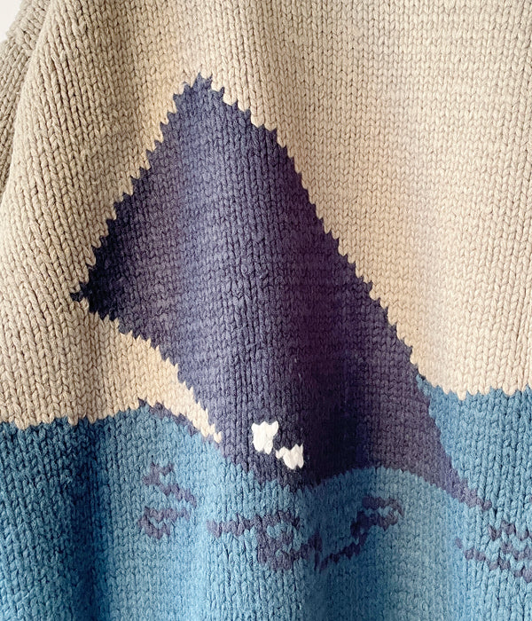 DESCENDANTから、SPYHOP COWICHAN SWEATERが入荷しました。太い番手で編み上げたざっくりとした仕上げのカウチンセーター。フロントジップにポケットからクジラの尾びれがのぞくデザイン。背面に大きく編み込みで表現したSPYHOPがインパクトのある1着です。