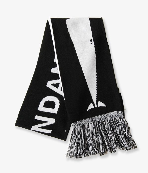 ジグザグの幾何学模様の裏面に、DESCENDANTとクジラのロゴを編み込んだジャカード仕立てのフリンジ付きマフラー。