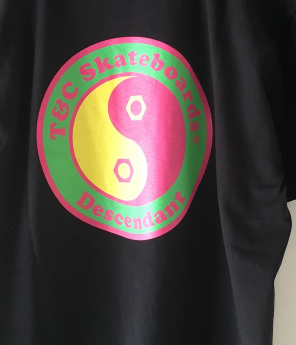 T&Cのアイコンである陰陽のロゴに双方のブランドネームを綴ったコットン天竺のプリントTシャツ。右袖にT&Cのピスネーム、右裾にDESCENDANTのピスネーム付き。