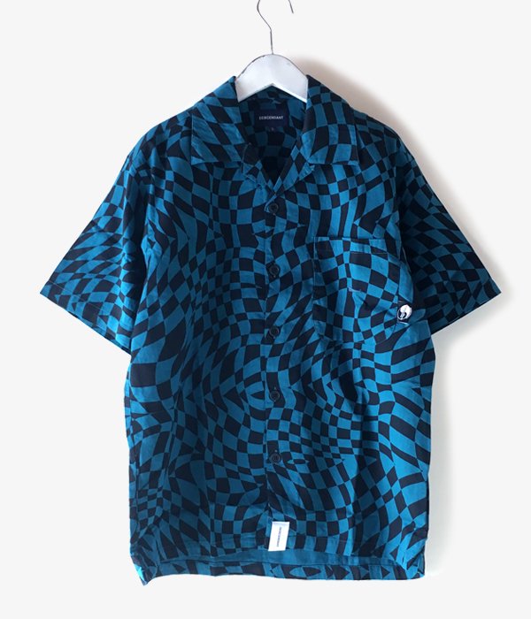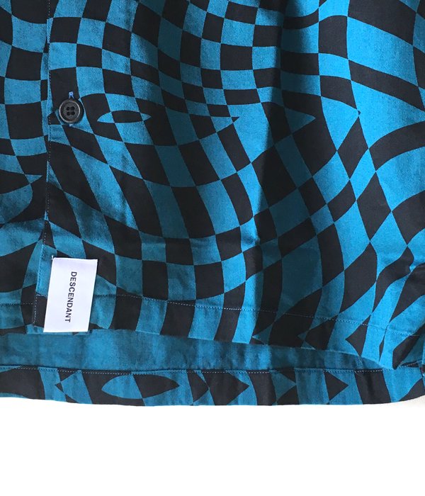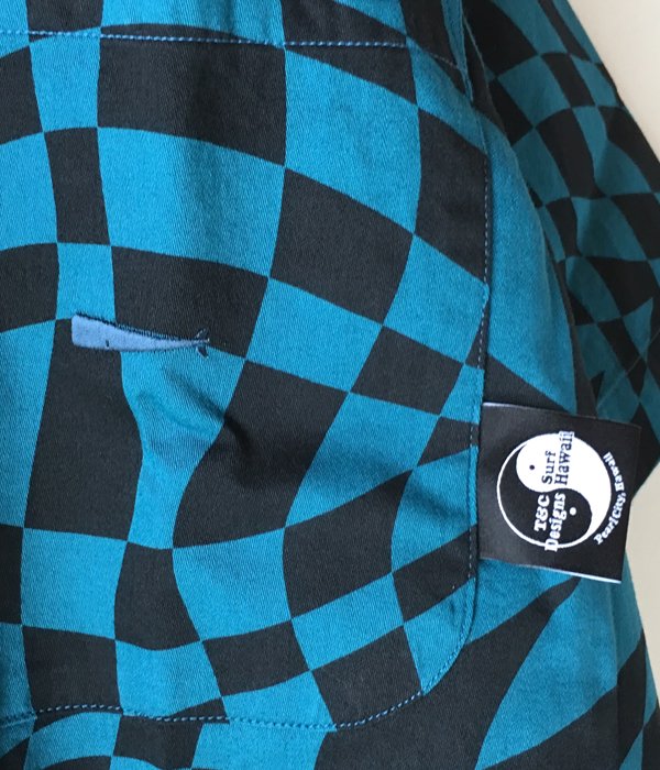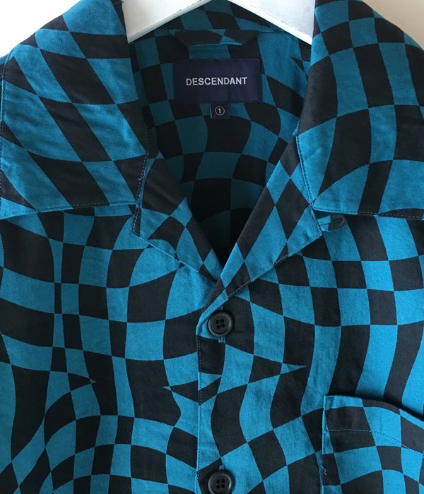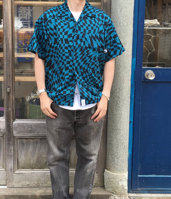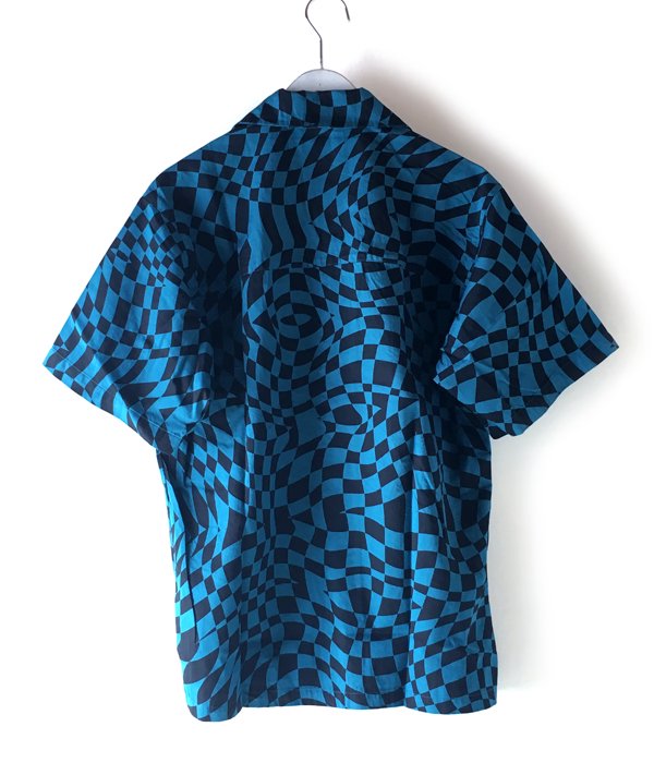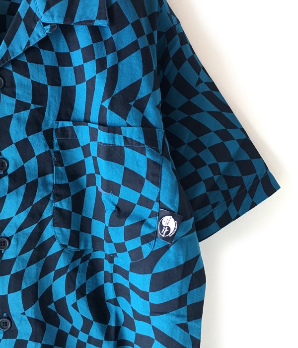 1970年代にサーフやスケートチームで一世風靡したTOWN & COUNTRYとのコラボレーションより、当時のサーフボードに使用されたサイケデリックなチェッカー柄のオープンカラーシャツ。チェストポケット及び前立ての裾に各ブランドの織りネーム付き。