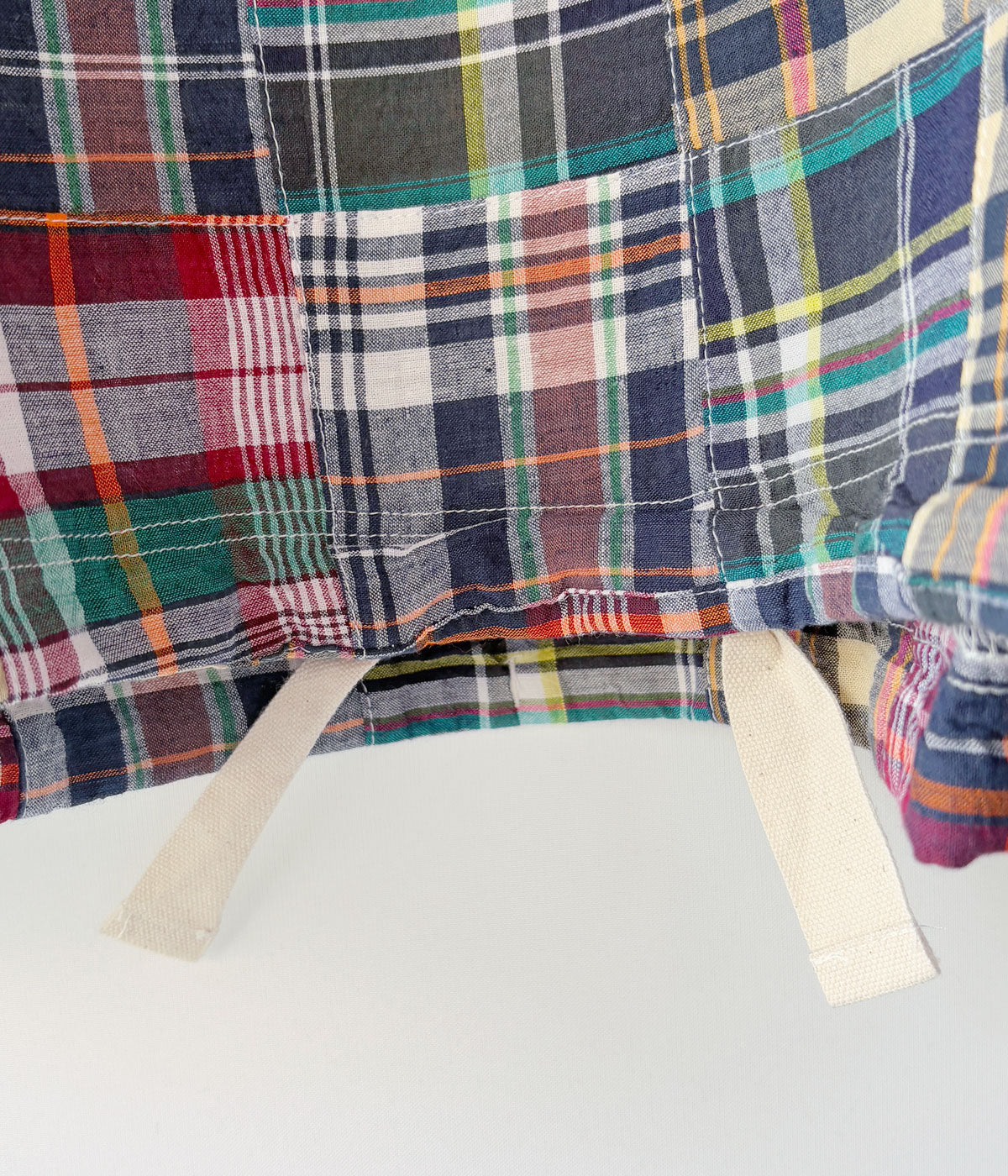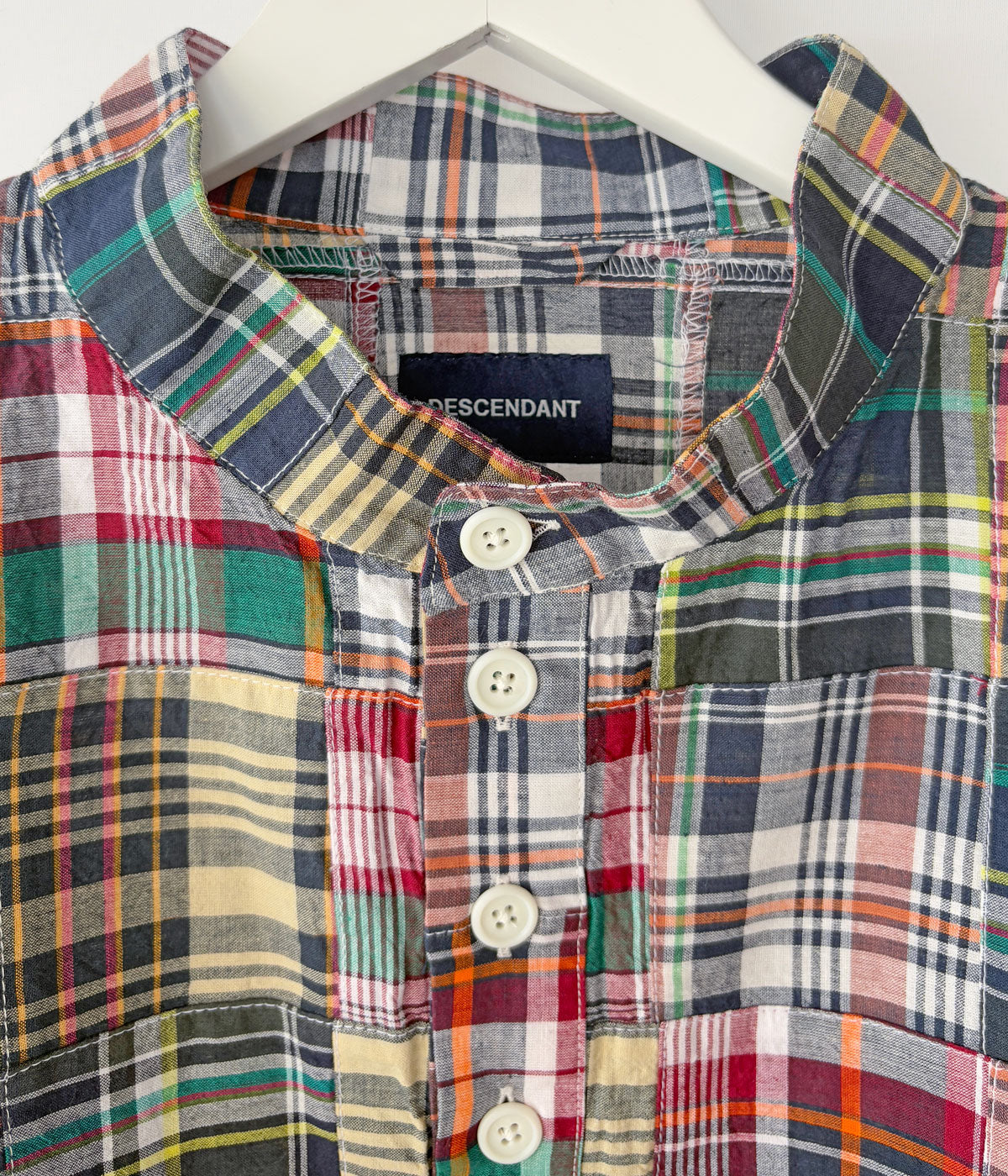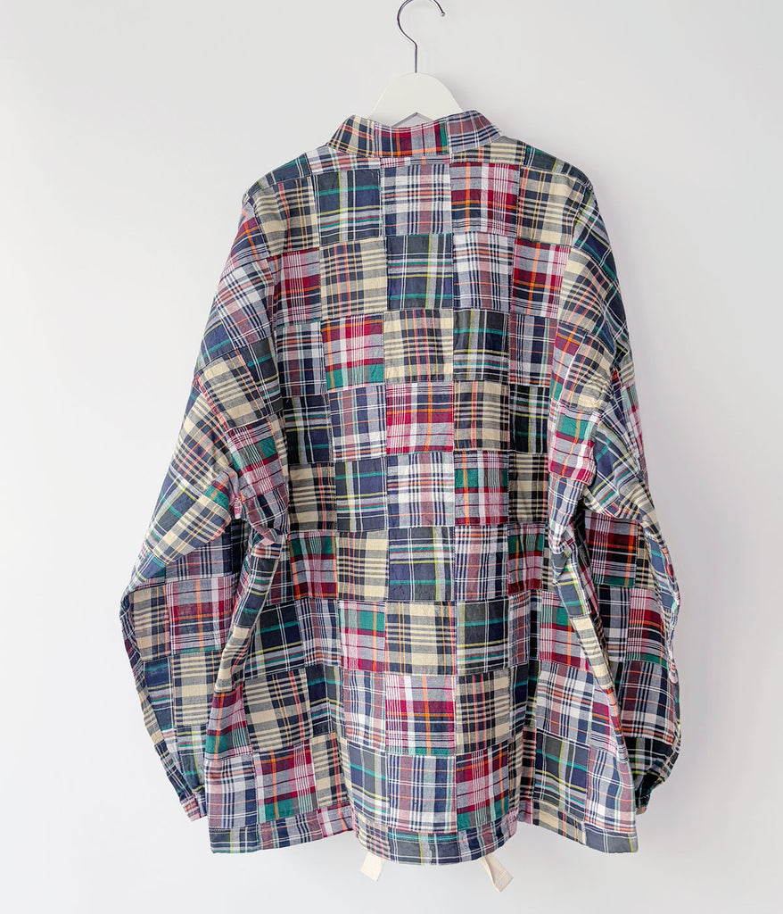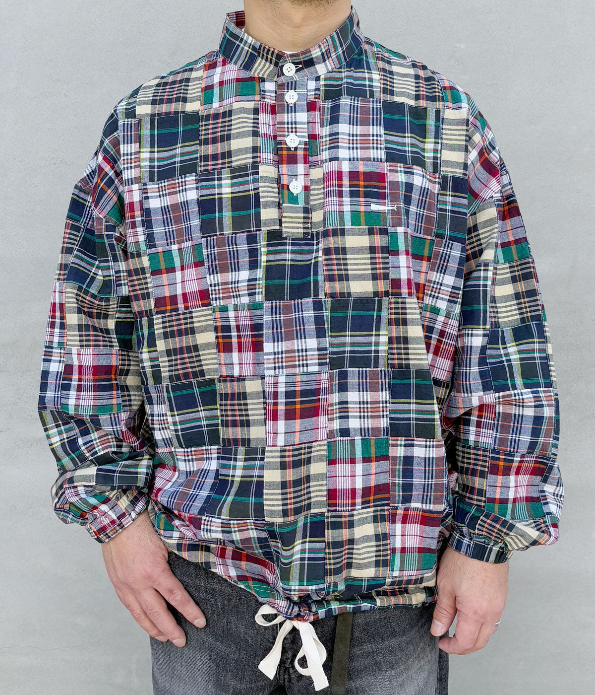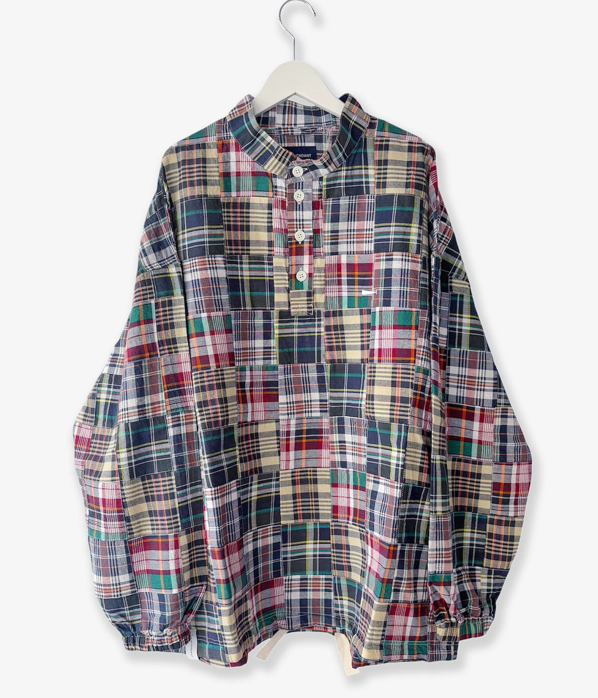 DESCENDANTから、TETTY PULLOVER PATCHWORK LS SHIRTが入荷しました。マドラスチェック柄のパッチーワーク素材を使用したプルオーバーシャツ。スタンドカラーに仕立て、裾周りにドローコードを配したアウター然とした仕上がり。左胸にCACHALOT刺繍が入ります。