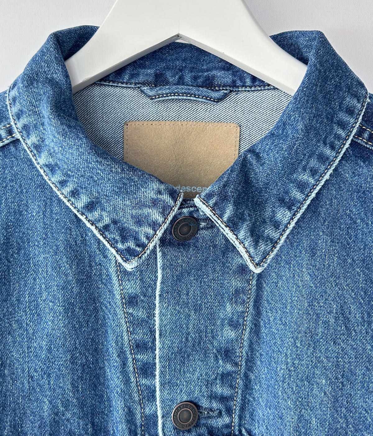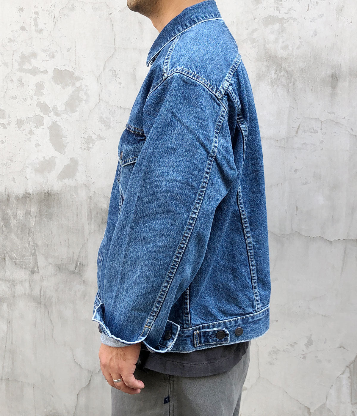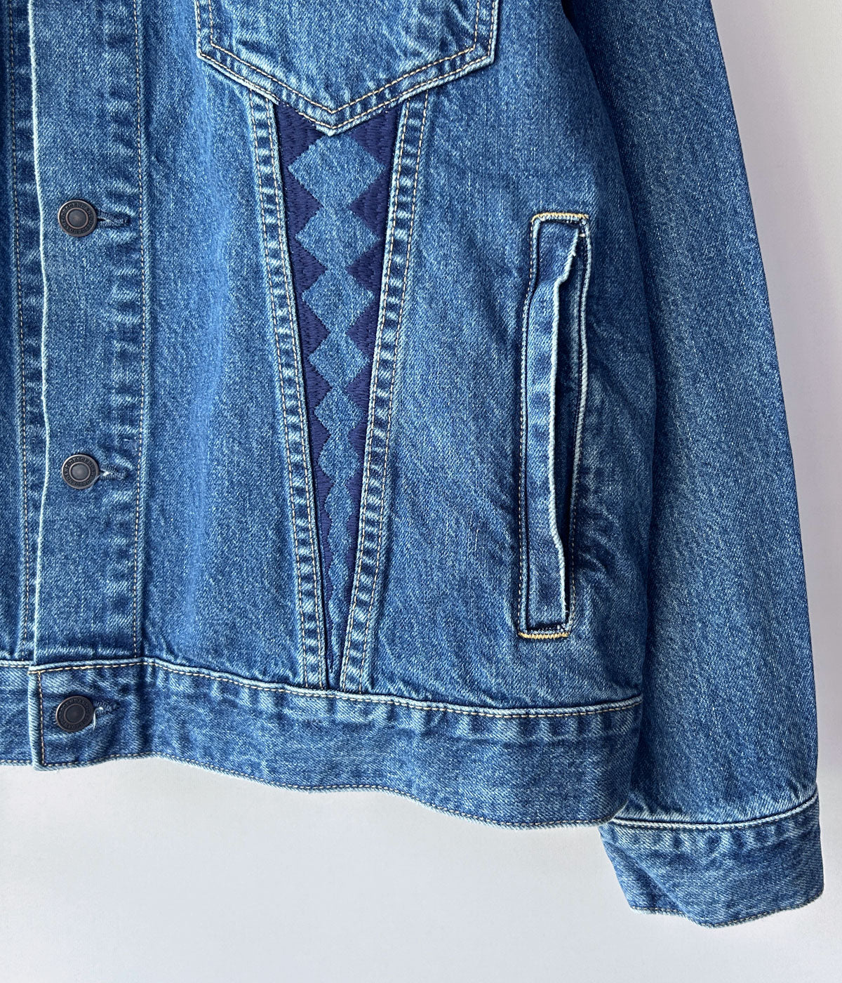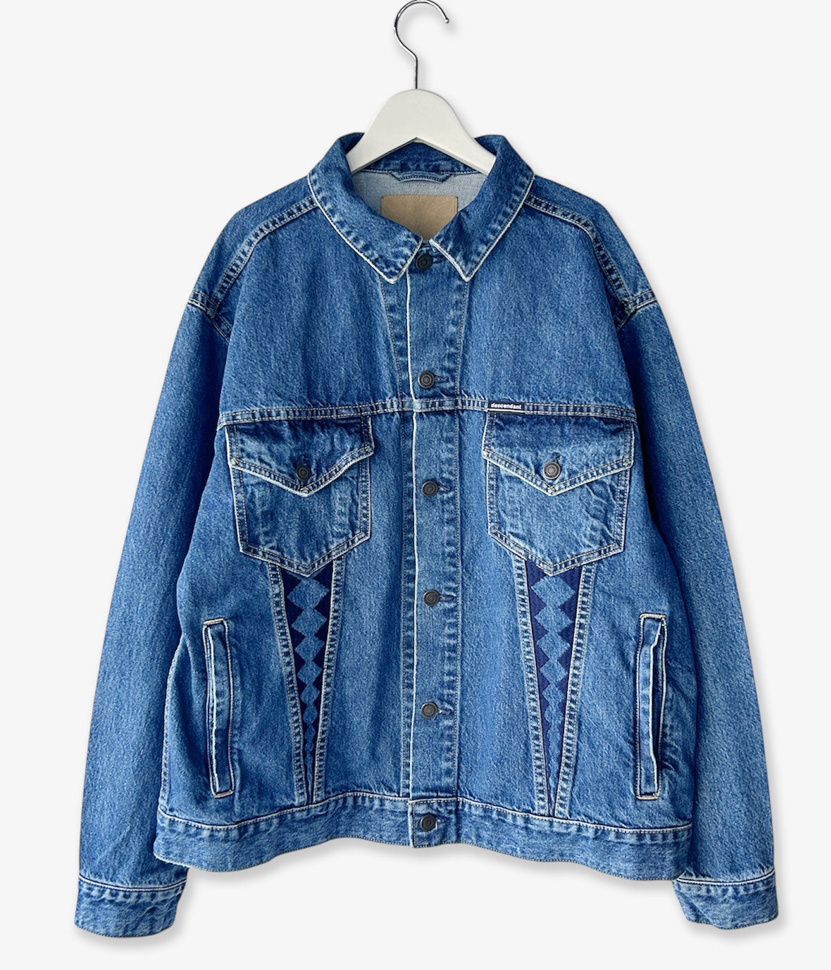 DESCENDANTから、TRUCKER DENIM JACKETが入荷しました。13ozのコットン製デニム素材を使用したトラッカージャケット。ウォッシュ加工による味わい深い色落ちが美しい1着。フラップ付きのベース型ポケット、その下にサメの歯や波模様をモチーフにした刺繍飾りを施しました。両サイドにハンドウォーマーポケットを携えた作り。