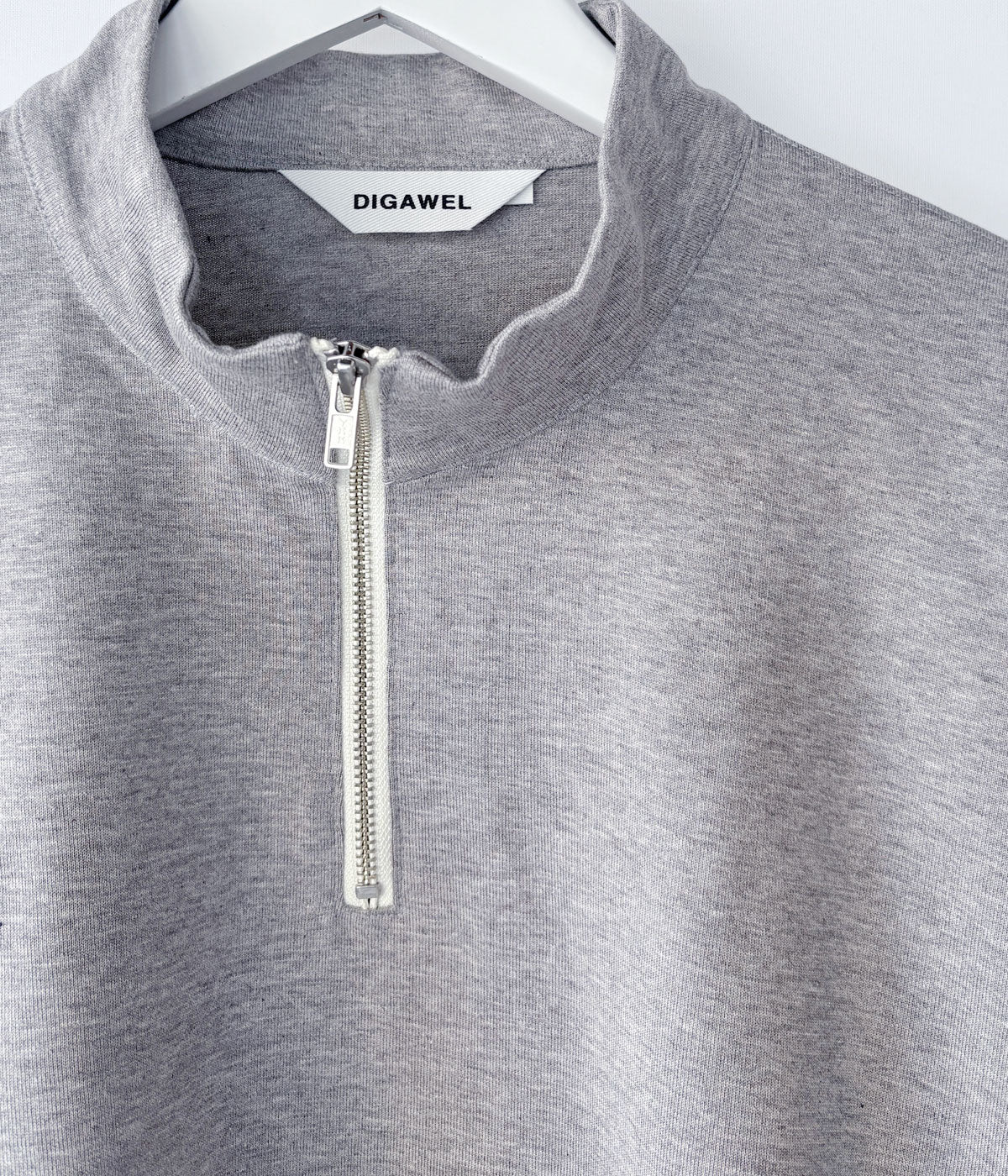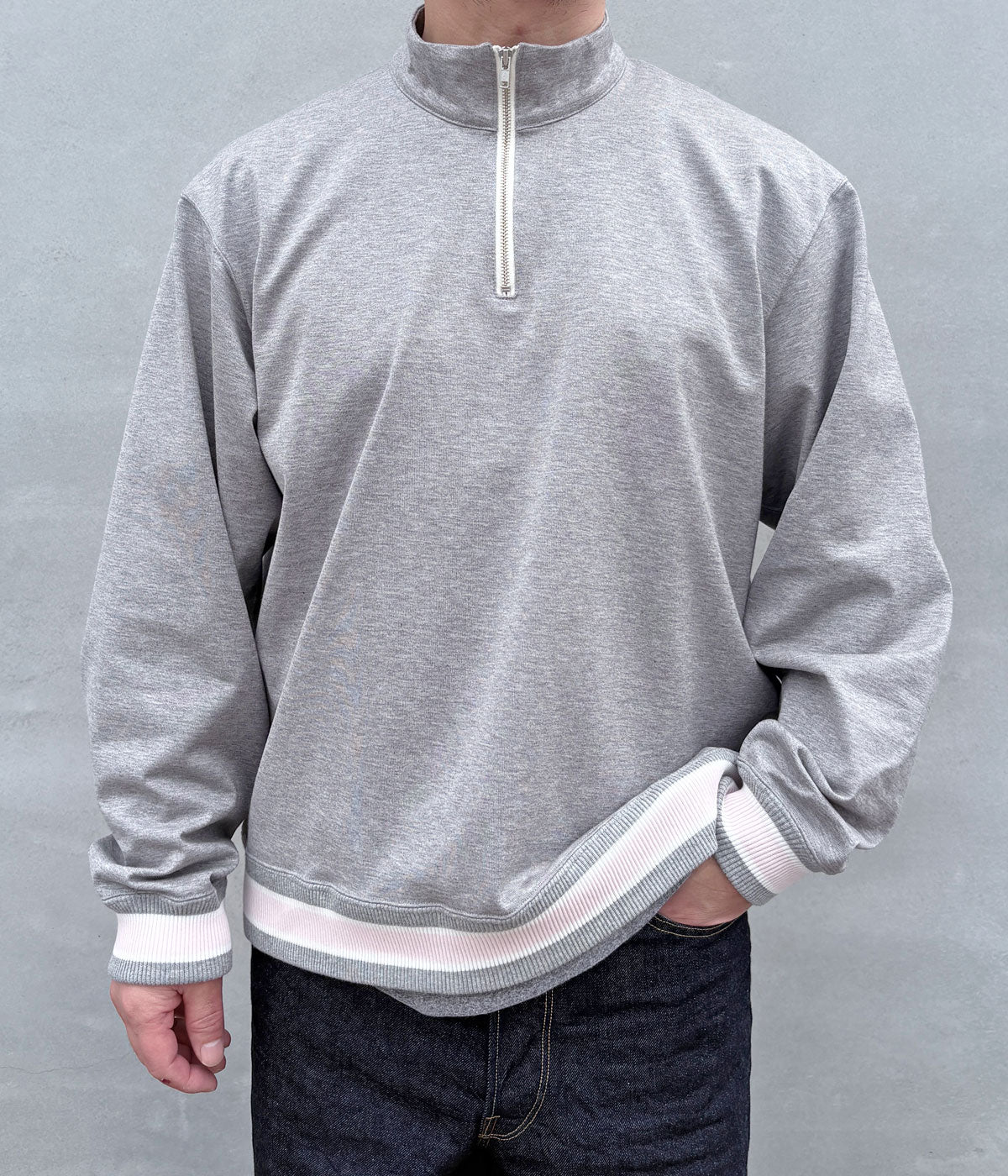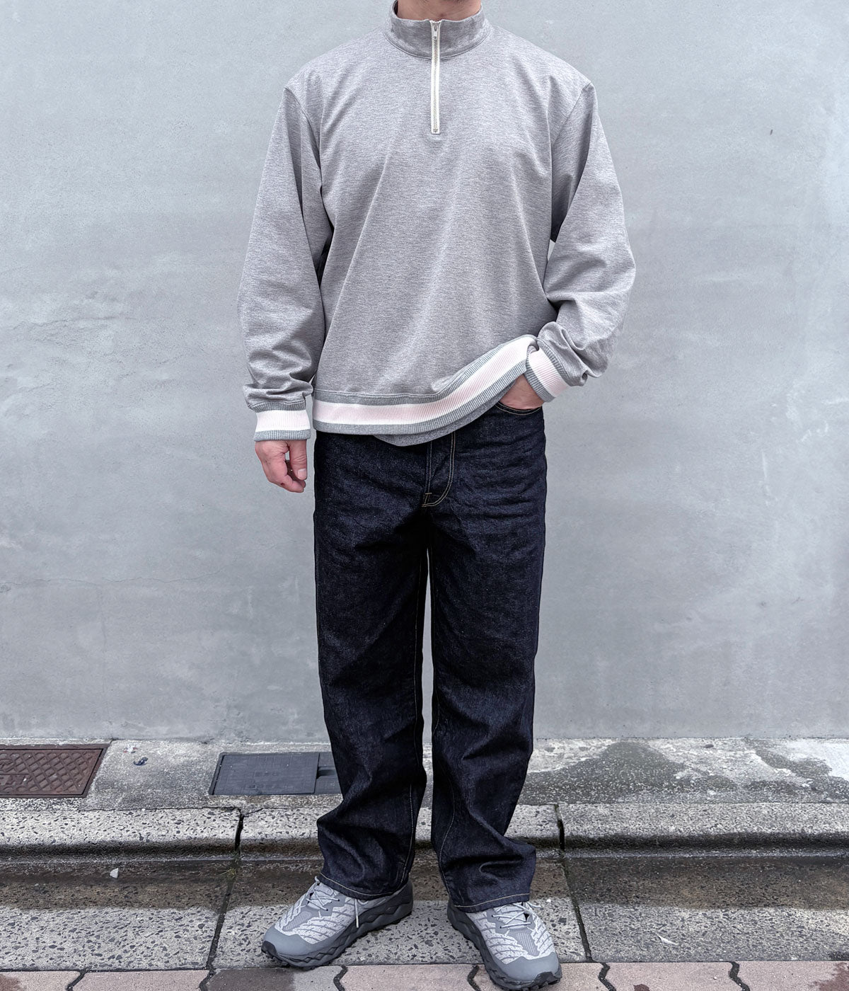DIGAWELから、Half zip P/Oが入荷しました。裏毛ではなく、天竺製のジャージー素材で作ったハーフジッププルオーバーです。ファスナー仕立てのスタンドカラーと、リブに施したカラーラインがポイント。ロンT感覚でロングシーズン使える1着です。