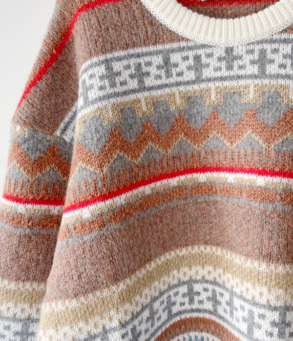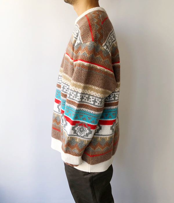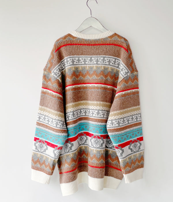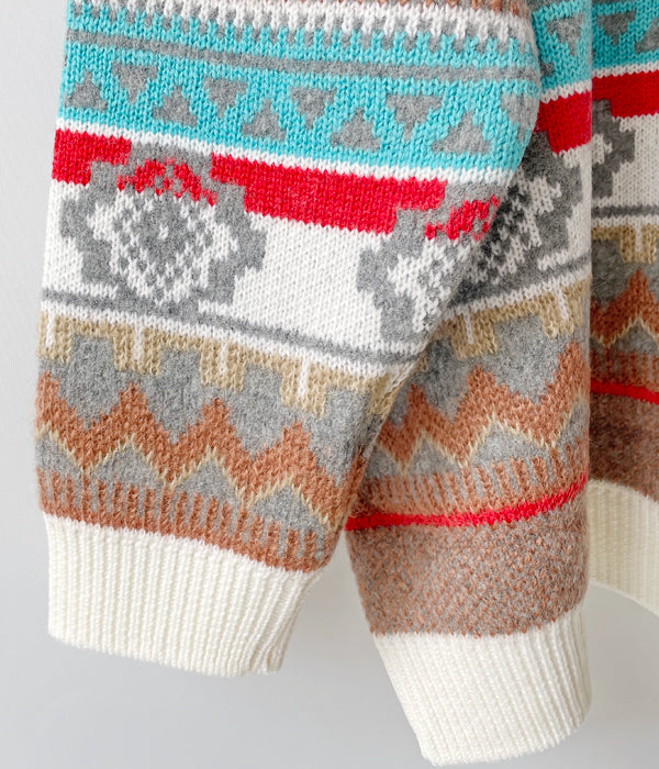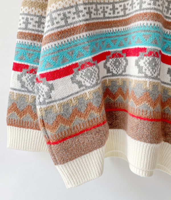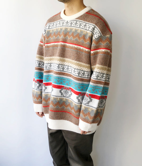 DIGAWELから、JACQUARD SWEATERが入荷しました。ジャカード織りで表現された模様が美しい、ボリュームのあるざっくりとしたフォルムのクルーネックセーター。ホワイトカラーのリブ仕立てに飾り付けた襟ぐりと、裾と袖口がポイント。
