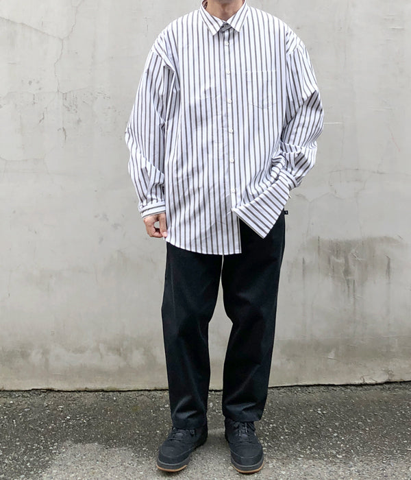 DDIGAWELから、OVERSIZED SHIRTが入荷しました。白地ベースのタイプライターストライプによる爽やかな雰囲気のレギュラーカラーシャツ。その名の通りな大きなサイジングで存在感のある一着。細身のカフスで収まりが良く、バストにパッチポケットを配置したデザイン。
