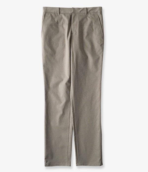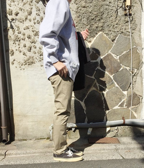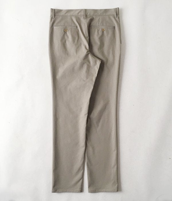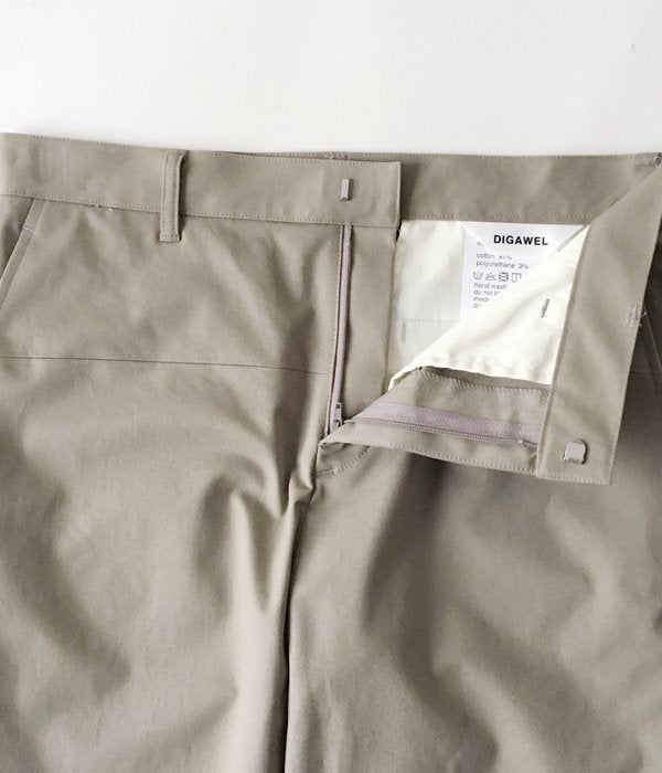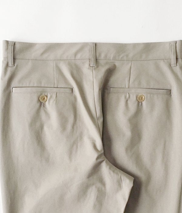 ハリのあるコットンを使用したスリムパンツ。フロントの切り替えがタックインスタイルに映えそうなデザインの一着。春らしい淡い色味をピックアップしました。
