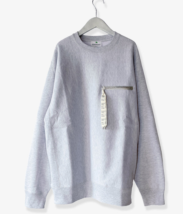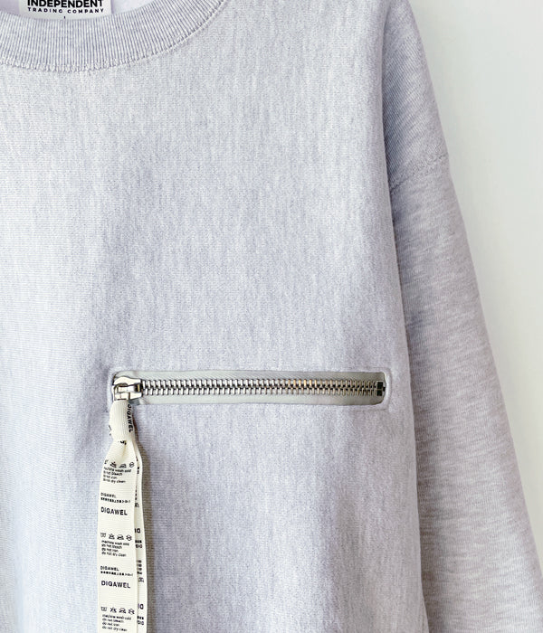 DIGAWELから、Sweatshirt(ready-made) INDEPENDENT<IND5000C>が入荷しました。INDEPENDENTボディIND5000Cを使用し、大胆な改造を施したクルーネックスウェット。左胸にジップ付きのポケットを後付けし、品質表示をプリントした長いリボンの引き手をアレンジしたデザイン。ゆったりとしたサイズ感の1着。