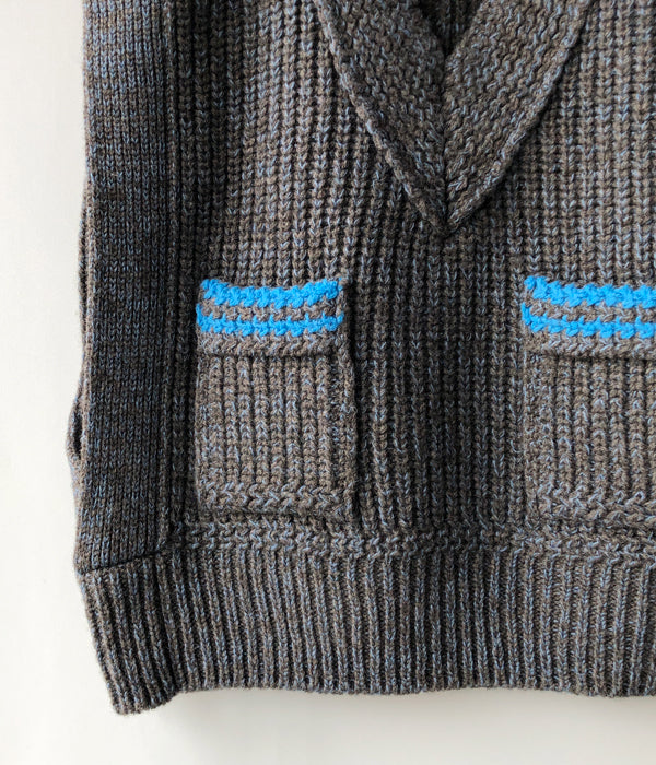 FUMIKA_UCHIDAから3G Mix Shetland/OVER VESTが入荷しました。オリジナルの色にブレンドしたニュアンスがあるトップカラーのシェットランドウール糸を使ったニットベスト。オーバーショルダーでアームホールが裾リブまで大きく開くIラインシルエットと安心のヒップ丈。ヴィンテージのセーターからインスパイアの振り柄編みで厚みのある襟とポケット、鮮やかなオリジナルカラーに染めた同素材の糸のラインがスポーティーな印象とクラシカル過ぎないアクセントに。