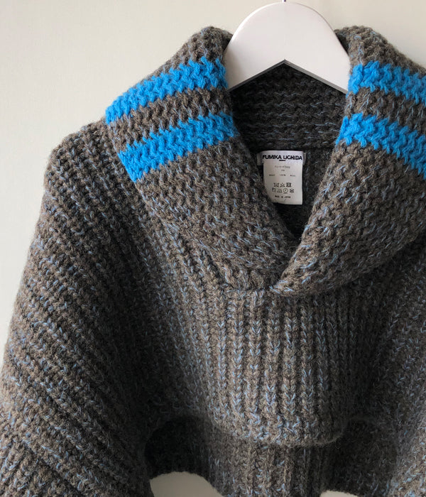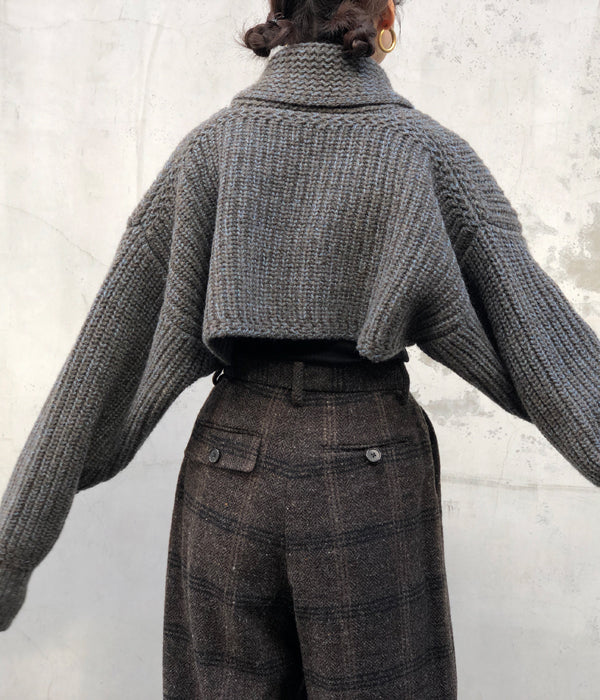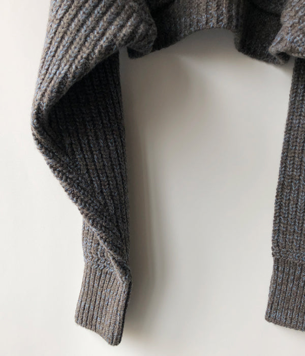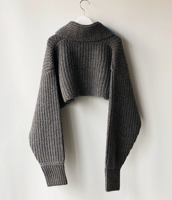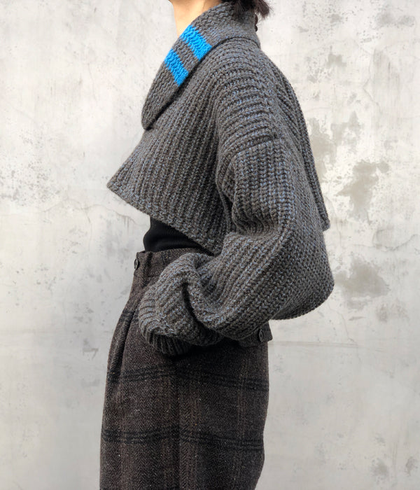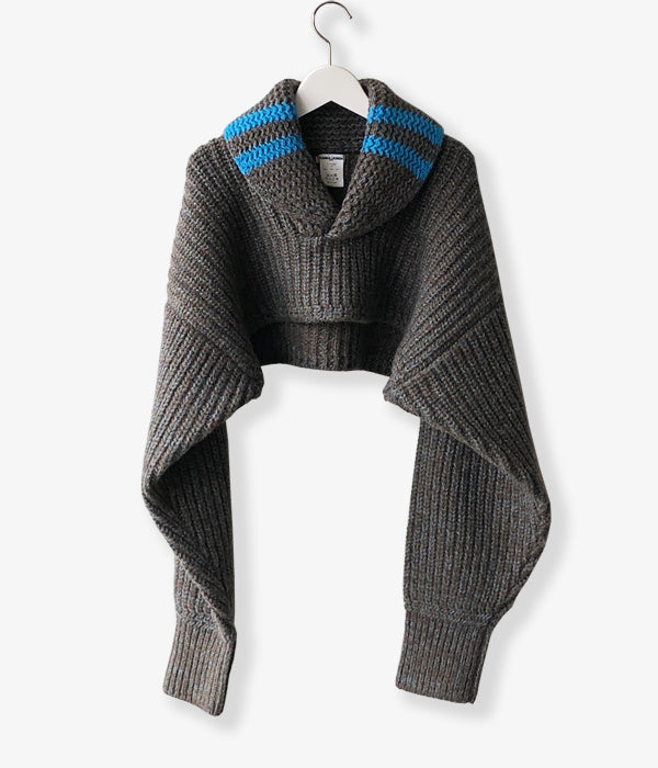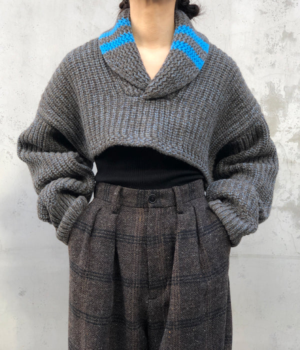 FUMIKA_UCHIDAから3G Mix Shetland/SHAWL-COLLAR SLEEVE SWEATERが入荷しました。オリジナルの色にブレンドしたニュアンスがあるトップカラーのシェットランドウール糸を使ったセーター。袖を纏ったような極端に短い着丈、着丈と同じ幅のアームホールからのゆったり長い袖をたくし上げて着るイメージ。ヴィンテージのセーターからインスパイアの振り柄編みで厚みのあるショールカラー、鮮やかなオリジナルカラーに染めた同素材の糸のラインがスポーティーな印象とクラシカル過ぎないアクセントに。