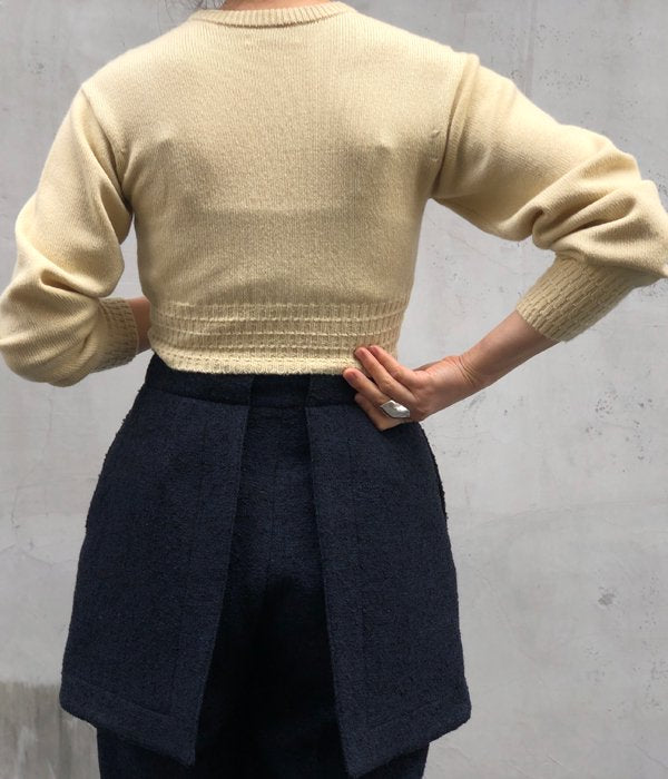 FUMIKA_UCHIDAから7G CASHMERE_CREW-NECK SHORT SWEATERが入荷しました。イタリアCHARRIAGE社のカシミア糸を使用したショート丈のクルーネックセーター。袖、裾にデザイン的で機能性のある編み地を施しています。上質でふわっと軽いカシミアの暖かさがありながらもショート丈、というユニークなバランスを見せてくれる一枚。