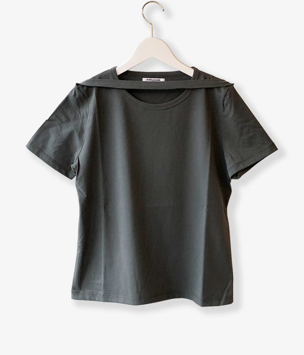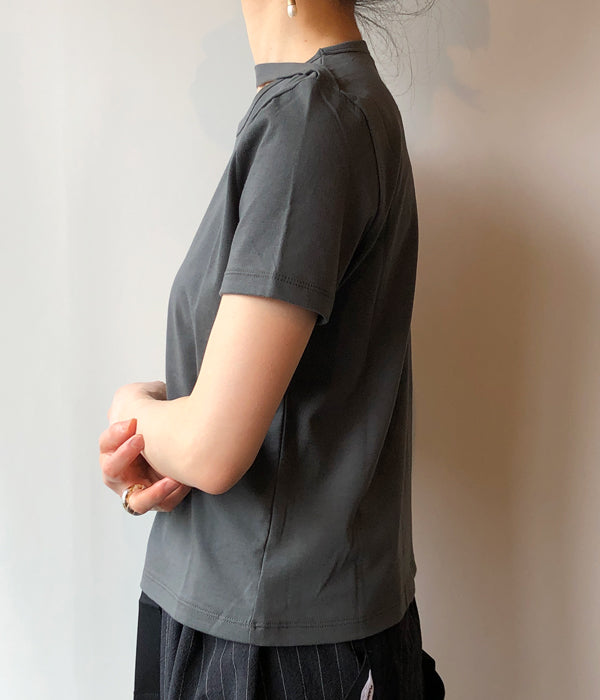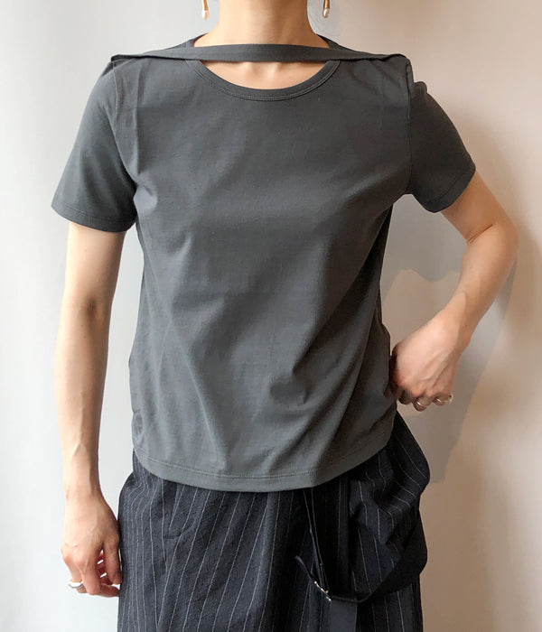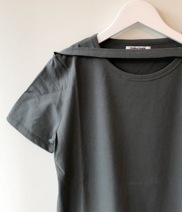 FUMIKA_UCHIDAからBONDAGE CHIBI SHORT-SLEEVE T-SHIRTが入荷しました。首元に拘束的な印象をもたらす1本のフライステープを両肩から渡し、首の前を通らせて着るショートスリーブTシャツ。洗い込んでも毛羽立ちが少なく風合いが損なわれない特性を持つ、度目を詰めて編み立てたオーガニックコットンのオリジナル生地を使用。ジャストショルダー、ややタイトでストレートな身幅でヒップ上丈のコンパクトなデザインとなります。