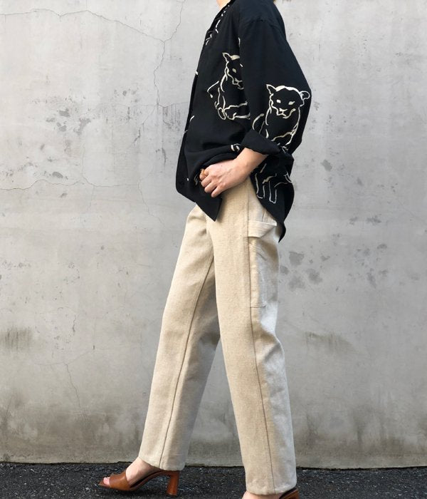 FUMIKA_UCHIDAからCANVAS BONDING PAINTER PANTSが入荷しました。20SSのリピート型に新色を加えて登場。リネンの清涼感のある素材にカットソーをボンディングし厚みを持たせたオリジナル生地。ストレートシルエットでボーイッシュな雰囲気をボディコンシャスなトップスやヒール靴で崩して楽しみたい。洗濯をすると縮みやすい生地の為、クリーニングでお願い致します。