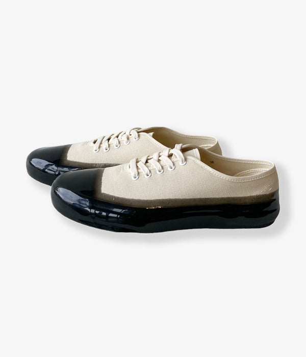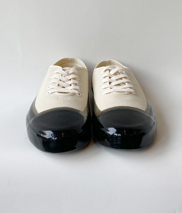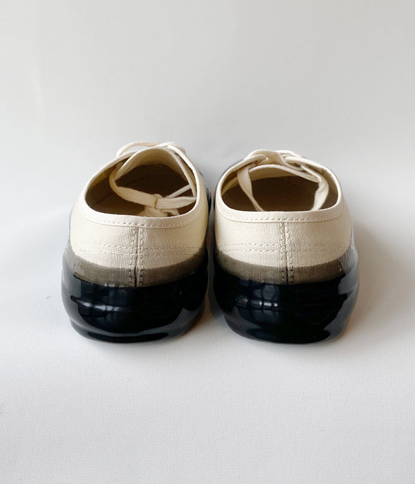 FUMIKA_UCHIDAからCANVAS SNEAKERSが入荷しました。50年代のスニーカーのような浅く甲の低いスニーカーをイメージした木型を使用し作成したローカットスニーカー。スニーカーにレインカバーを被せたような見え方をイメージしたデザインです。トゥーとサイドラバーにオーバーラップするようにラバーを手作業でコーティングしている為、個体差があります。表記サイズより少し大きめの作り。