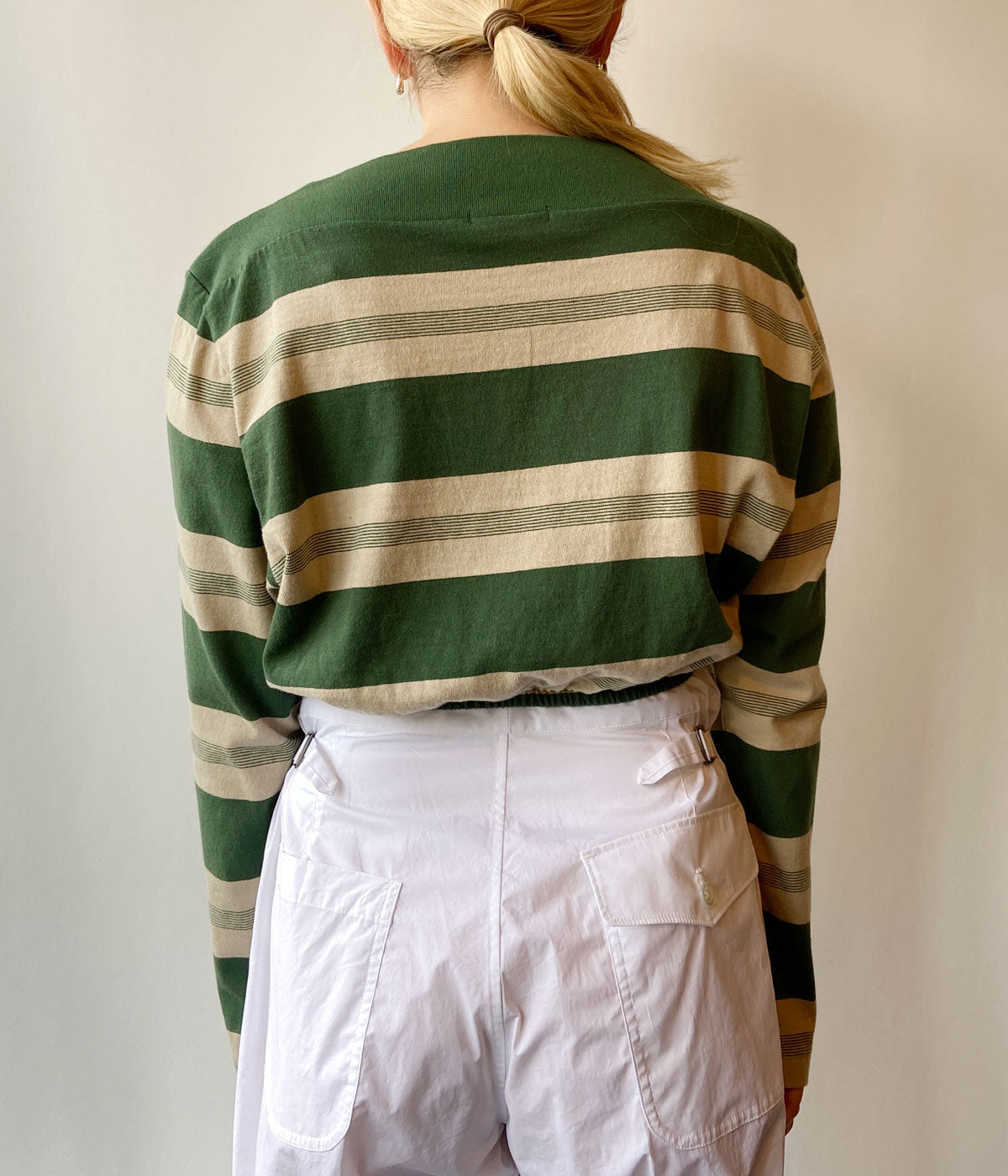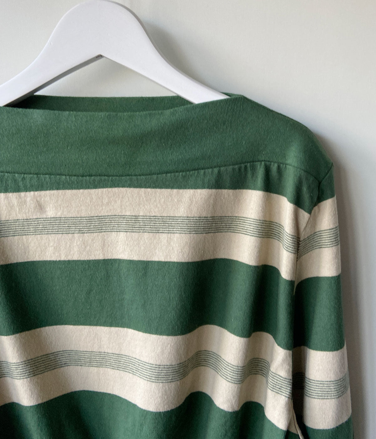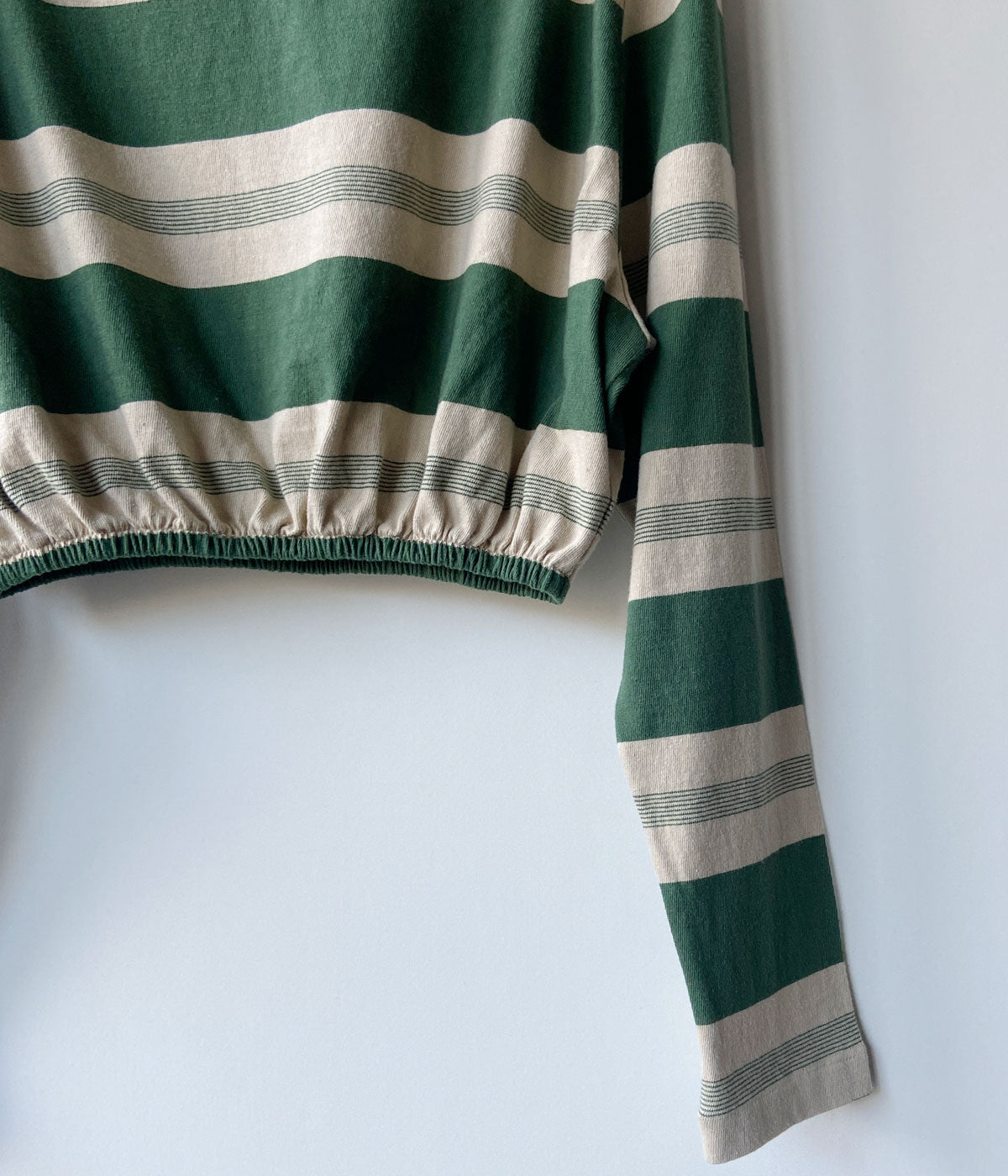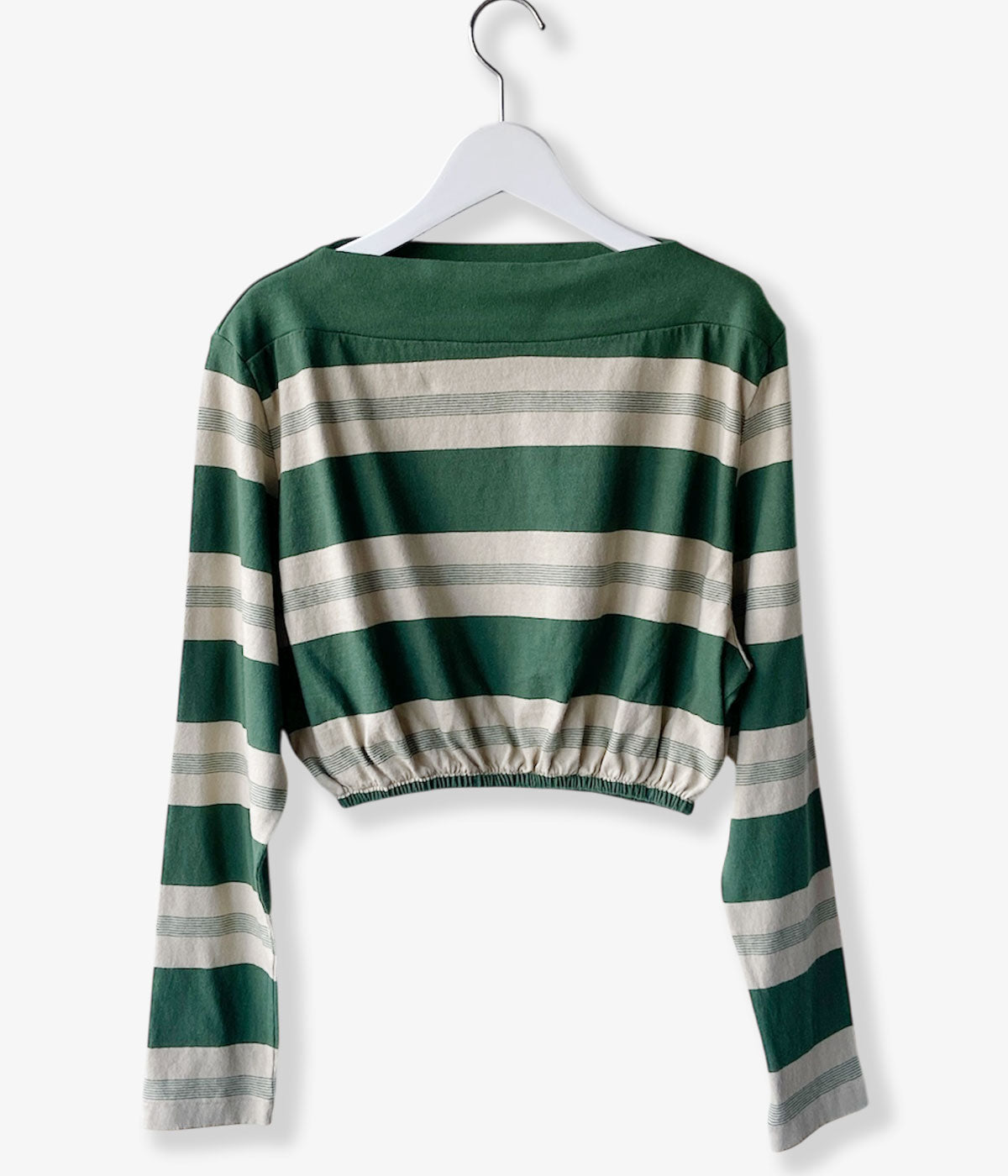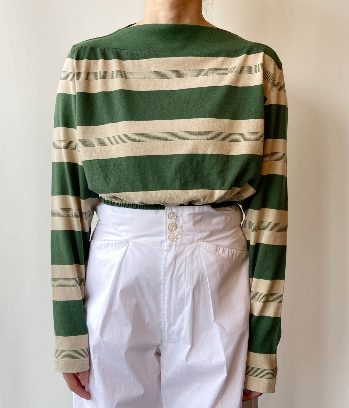 FUMIKA_UCHIDAからCOTTON JERSEY CROPPED TOPが入荷しました。ヴィンテージライクな粗野さのあるコットン糸を使用したオリジナルのボーダー柄生地で作るクロップド丈のロングスリーブTシャツ。リブ素材をワイドに切り替えた立体感のあるボートネック。