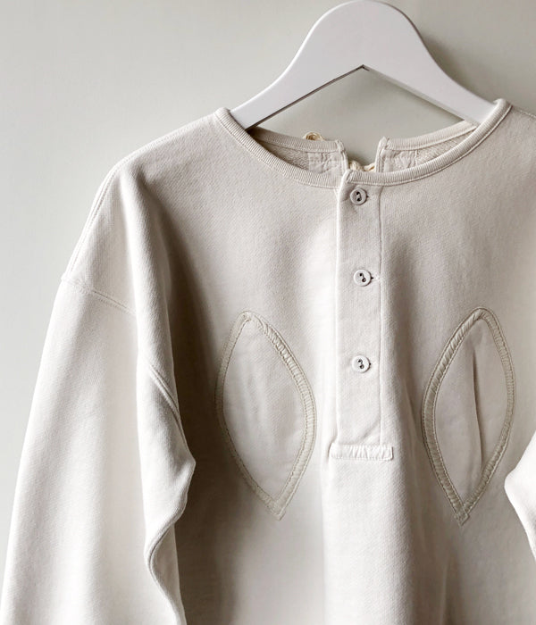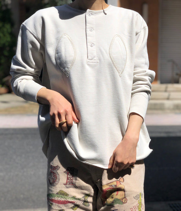 FUMIKA_UCHIDAからDefatted Fleece BACK OPEN SWEAT TOPが入荷しました。レモン型のパッチでバスト部分に膨らみを持たせる古いアンダーウェアから着想のバックオープンロングスリーブスウェット。加工を入れヴィンテージのように洗い込み目の詰まったドライタッチに仕上げたオリジナルのスウェット生地を使用。ヘンリーネック開きのフロント、センターバックはフルオープンで付属のオリジナル紐で開閉します。オーバーサイズでありながら随所にメリハリをつけたシルエットがポイントの一着。