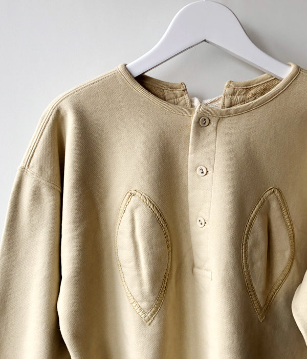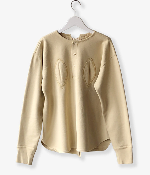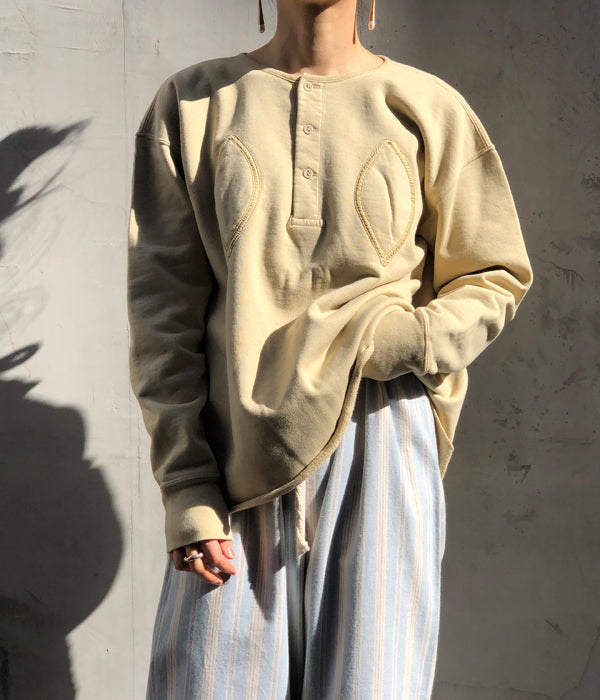 FUMIKA_UCHIDAからDefatted Fleece BACK OPEN SWEAT TOPが入荷しました。レモン型のパッチでバスト部分に膨らみを持たせる古いアンダーウェアから着想のバックオープンロングスリーブスウェット。加工を入れヴィンテージのように洗い込み目の詰まったドライタッチに仕上げたオリジナルのスウェット生地を使用。ヘンリーネック開きのフロント、センターバックはフルオープンで付属のオリジナル紐で開閉します。オーバーサイズでありながら随所にメリハリをつけたシルエットがポイントの一着。