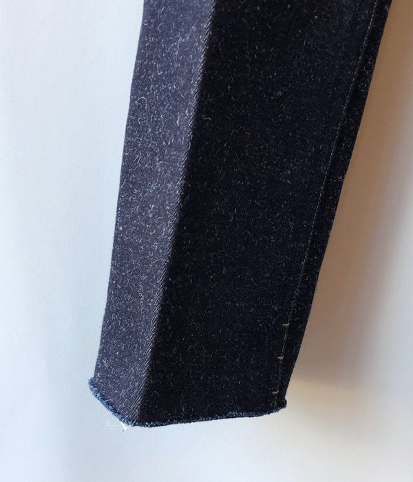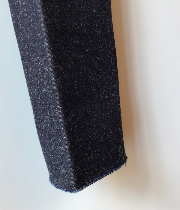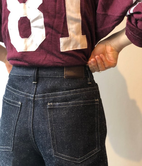FUMIKA_UCHIDAからDENIM BONDING WIDE STRAIGHT PANTSが入荷しました。縦糸にケナフを使用した独特の表情を持つデニム生地。素材感を活かしながら内側にはカットソーがボンディングされ厚さがある為、ウエストには開閉し易いひねりロックとジップを採用。ハイウエストから後ろ腰位置までがフィットした女性的なライン、ヒップから裾までは太く大胆なシルエット。前後に入ったセンタープレスによってスラックスのように着用できる、今までにないデニムパンツとなっています。