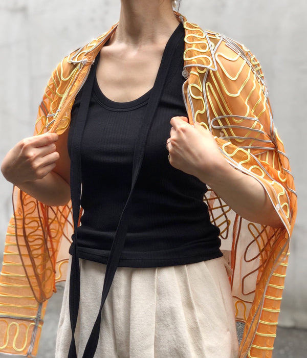 FUMIKA_UCHIDAからDOUBLE RIB U-NECK NEEDLE DRAWING NO-SLEEVEが入荷しました。首元のリブがダブルで付くデザインのUネックライン針抜きリブトップス。首の後ろから前に流れる左右で生地の地の目の使い方を変えたフライステープが前裾下で輪で繋がり、自由に垂らして形作るディテール。U型に広めに開く首元、脇はアームホールに添う清潔感のあるラインで今シーズンのローライズのボトムに合うようヒップ上丈の作りとなっています。
