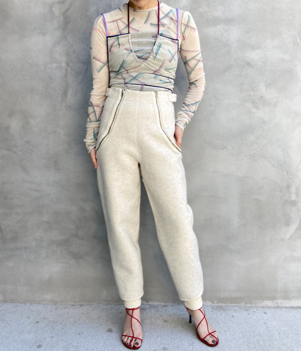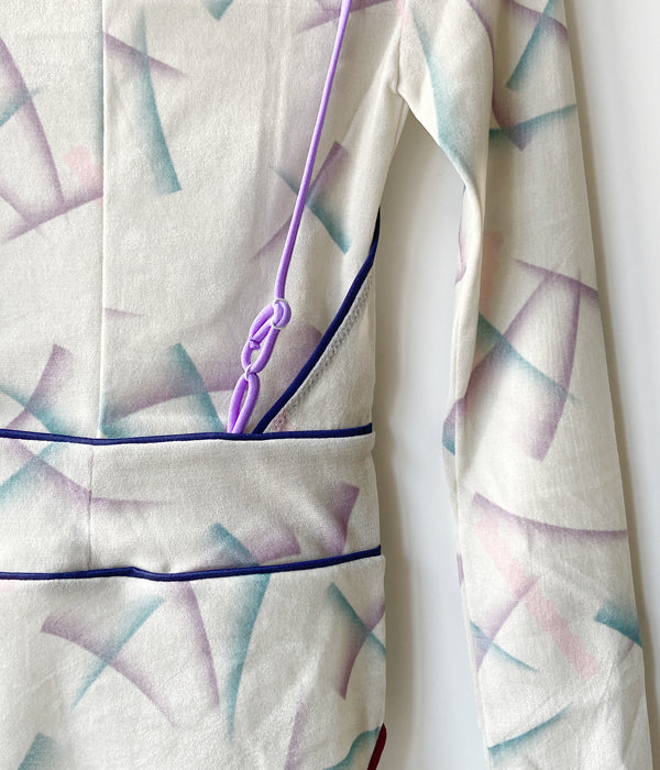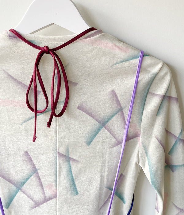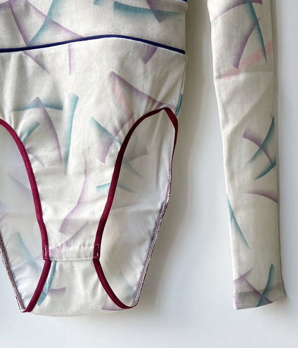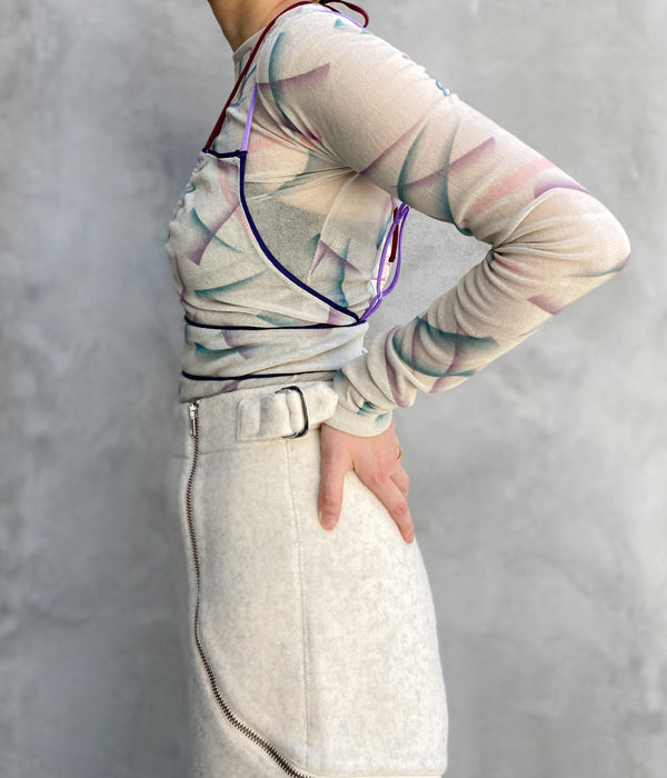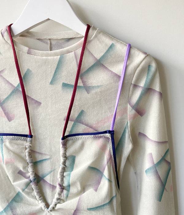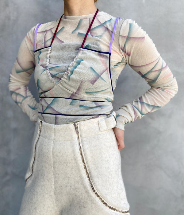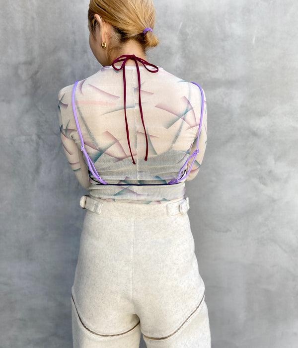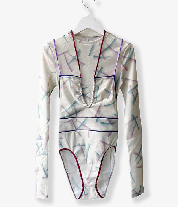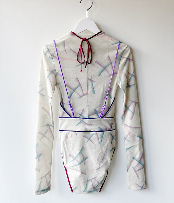 FUMIKA_UCHIDAからFLOCKY PRINTED TULLE DOUBLE-FRONT BODYSUITが入荷しました。レーヨンフロッキーを全面に加工したナイロンチュールを下地に使用し、さらにその上からオリジナルのインクジェットプリントを施したチュール素材のボディースーツ。長袖の上にキャミソールを重ねて着ているように見え、アウトドアを意識したポジティブな色使いでのトリミングやストラップでアクティブな印象です。胸元のストラップは上から羽織った時に首元のアクセントとなるディテール。股下のスナップテープで開閉。