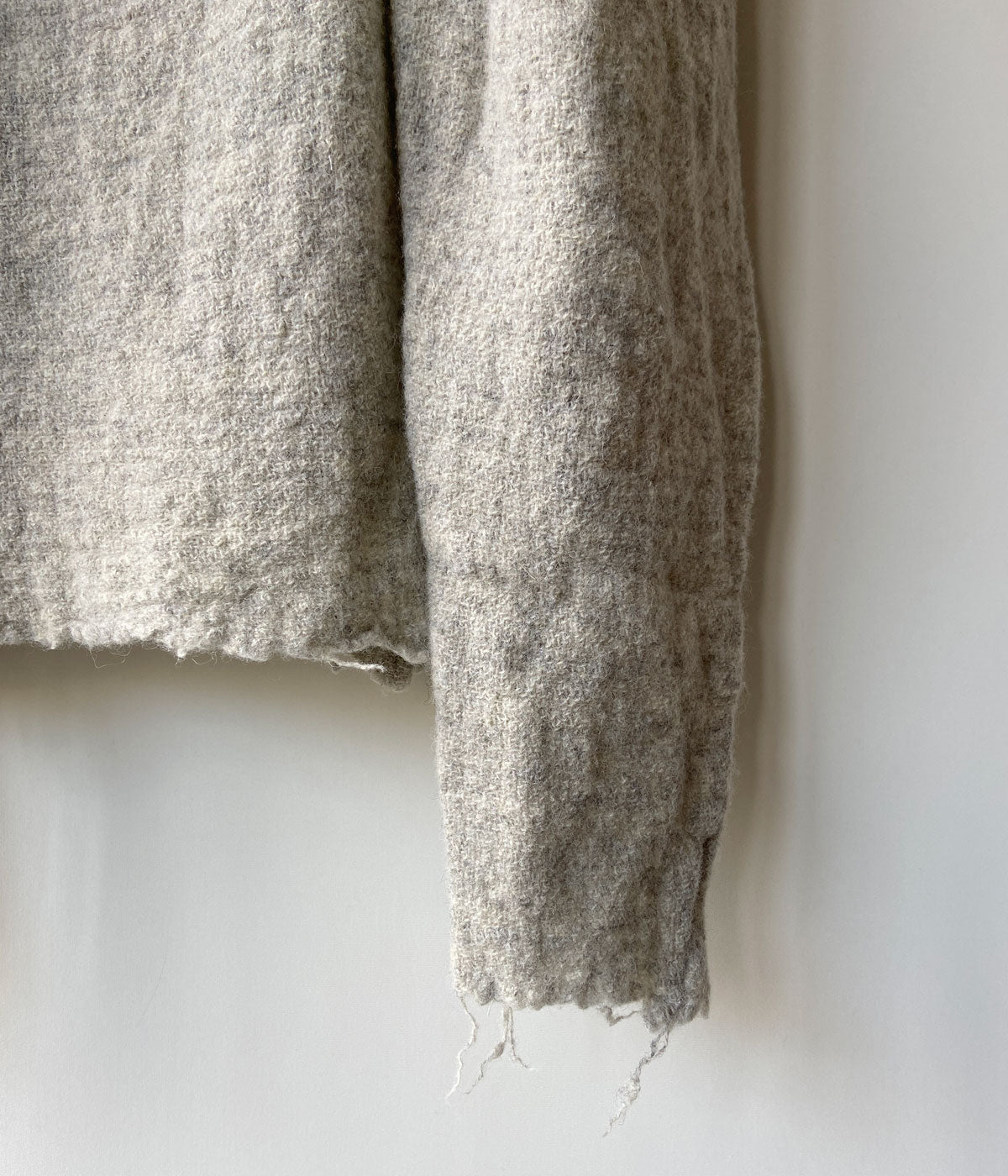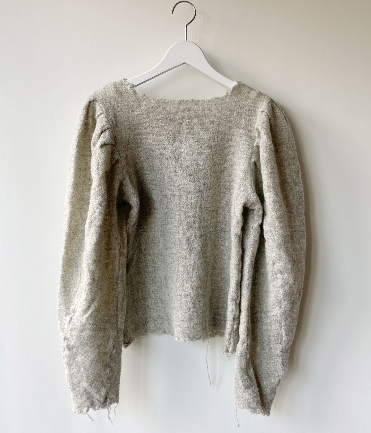 FUMIKA_UCHIDAからGAUZE SHETLAND PUFF-SLEEVE TOPが入荷しました。オリジナルのシェットランド糸を使用し、ガーゼ状に織り上げ、製品で縮絨加工を施すことでニットのように伸縮性のあるパフスリーブプルオーバートップ。截ち切りによるランダムでエッジでラフさのある仕上がり。