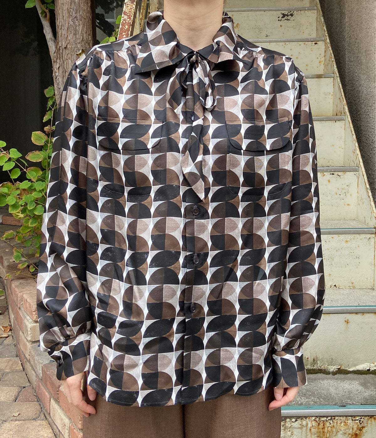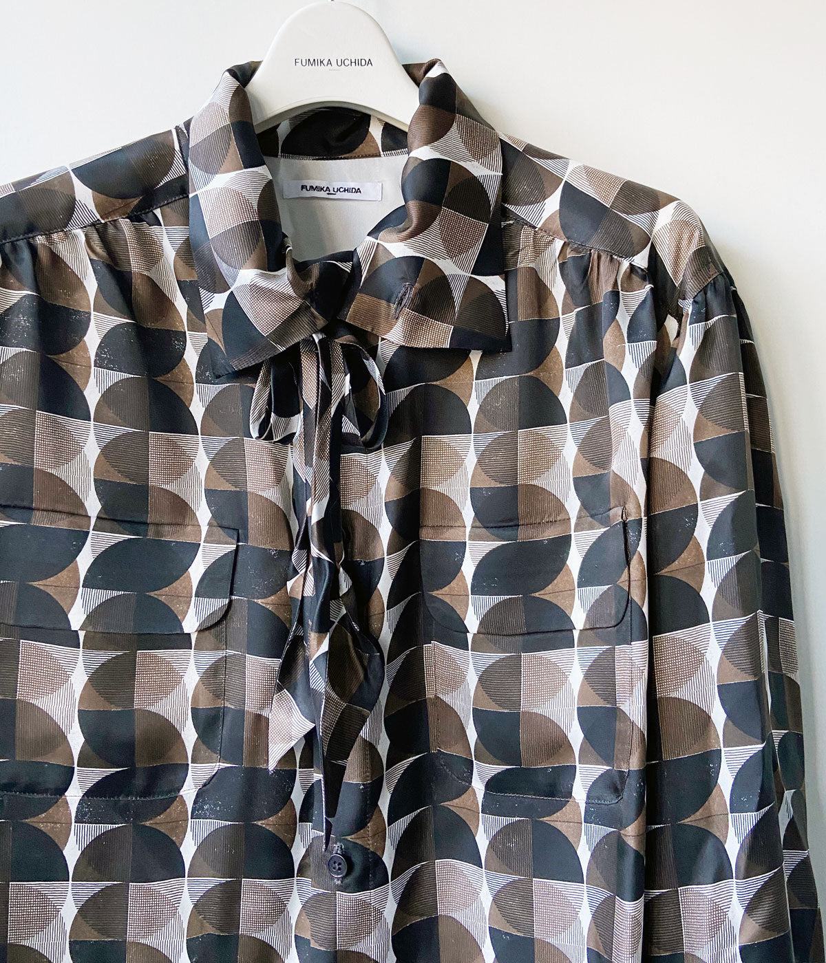 FUMIKA_UCHIDAからGEOMETRIC PATTERN PRINTED BLOUSEが入荷しました。スクリーンプリント特有の柄の繊細さ、滲み、色の奥行きで立体感のあるジオメトリック柄を施したキュプラツイル素材を使用したハイネックシャツ。高めの襟元にはボタンで取り外し可能なタイのディテール。