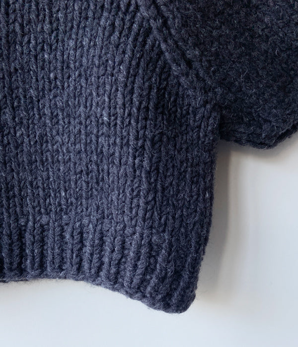 FUMIKA_UCHIDAからHAND KNITTED SHORT SLEEVE SWEATERが入荷しました。太く素朴な雰囲気のシェットランドウールのロービング糸を棒針編みで作るハンドニット。通常のウールに比べてスポンディッシュで軽く暖かいのが特徴です。狭めのクルーネックに、袖はラグランスリーブで肩にポイントを置いたラウンド系状で二の腕丈。編み手により個体差があります。
