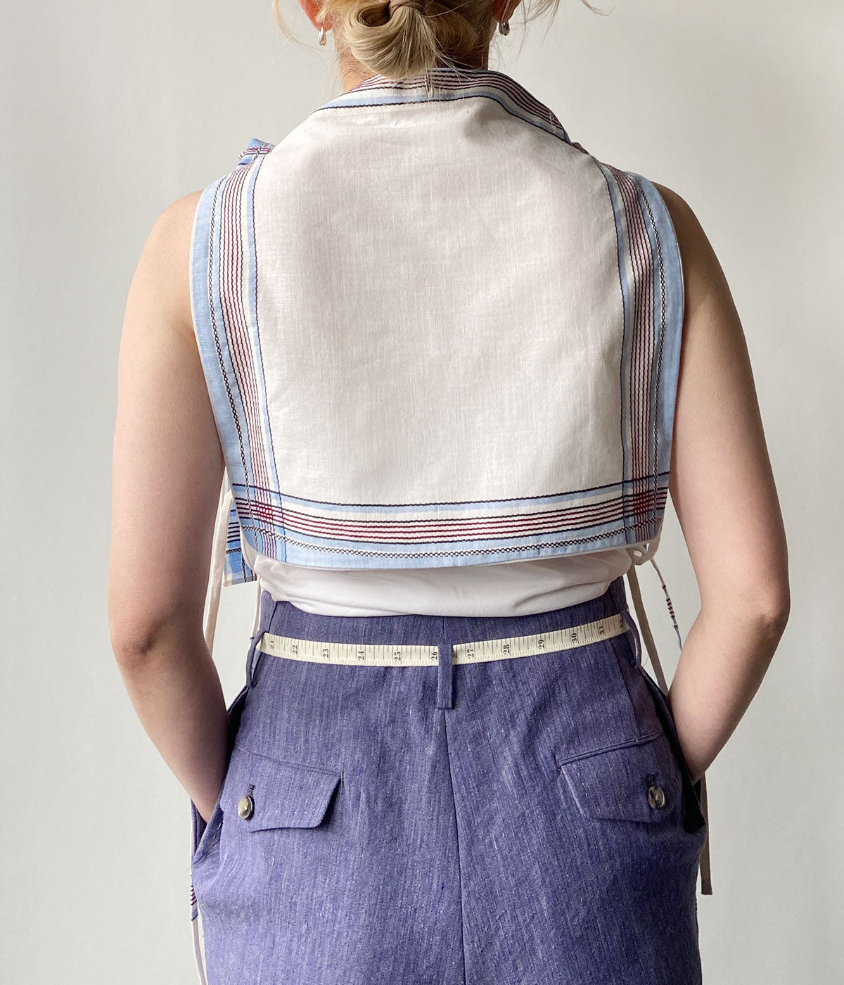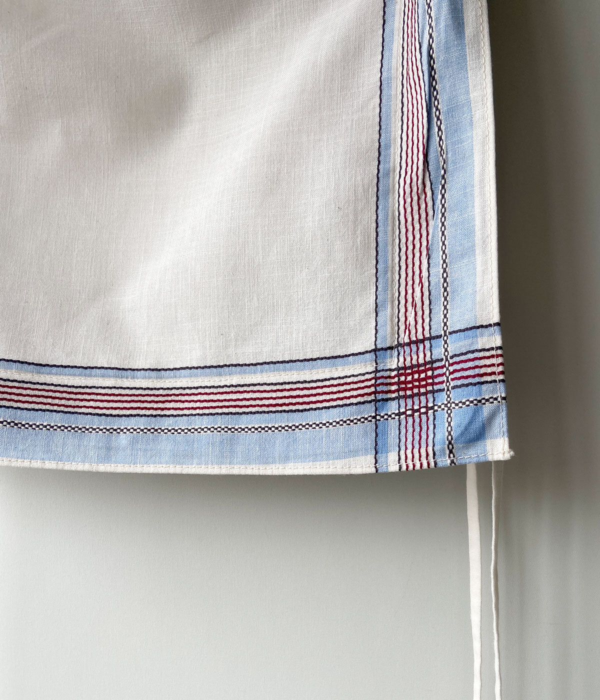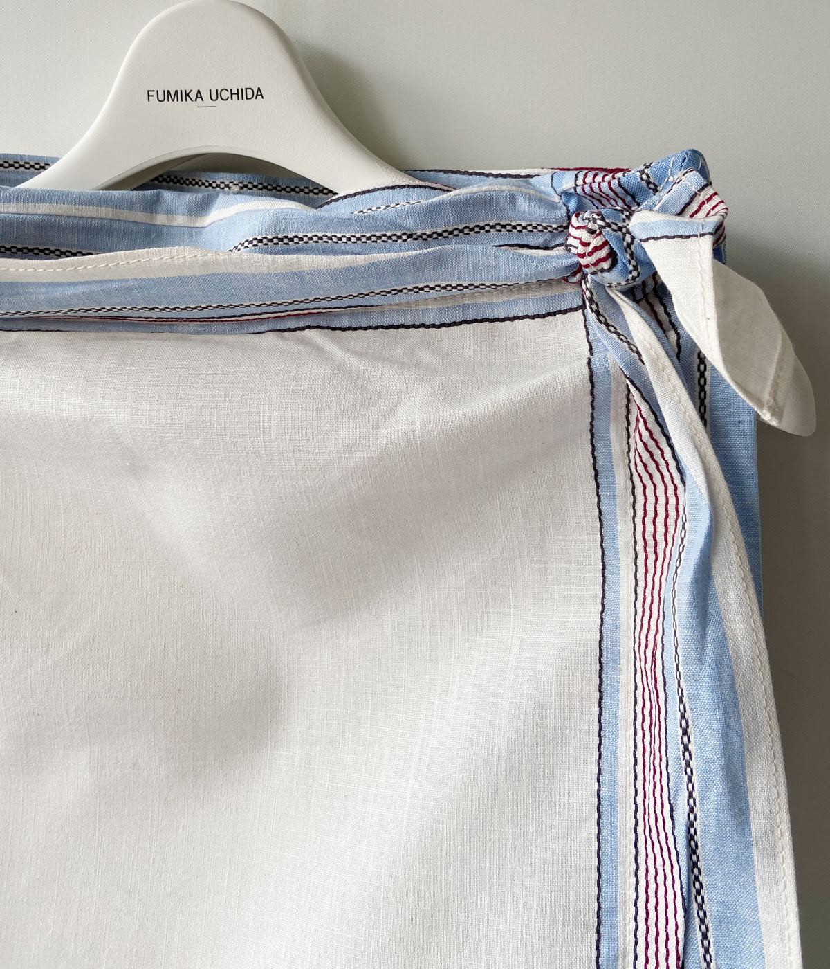 FUMIKA_UCHIDAからHANDKERCHIEF BIB TOPが入荷しました。コットンリネン素材のハンカチ柄ブルオーバートップス。コットンリネンのムラ糸をベースに番手違いの糸を使ったドビー織機でハンカチらしいスクエアーの枠柄を作成。ハンカチの2次元感を纏うデザイン。コンパクトなビブデザインです。