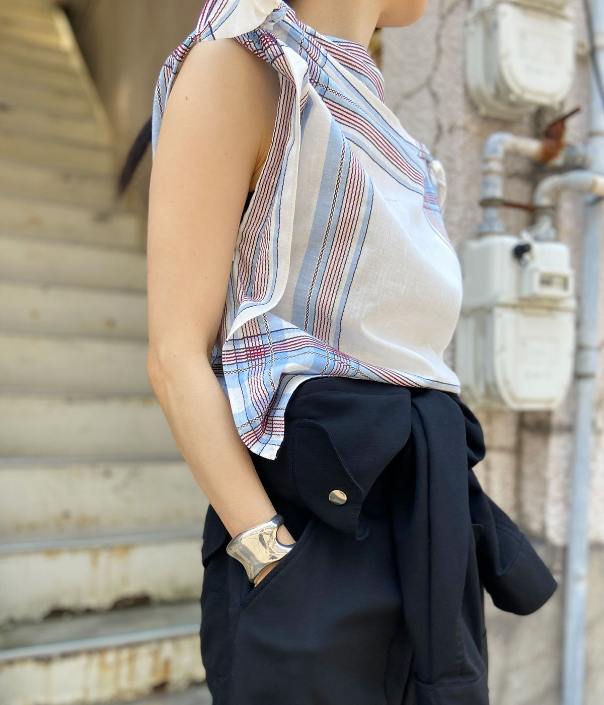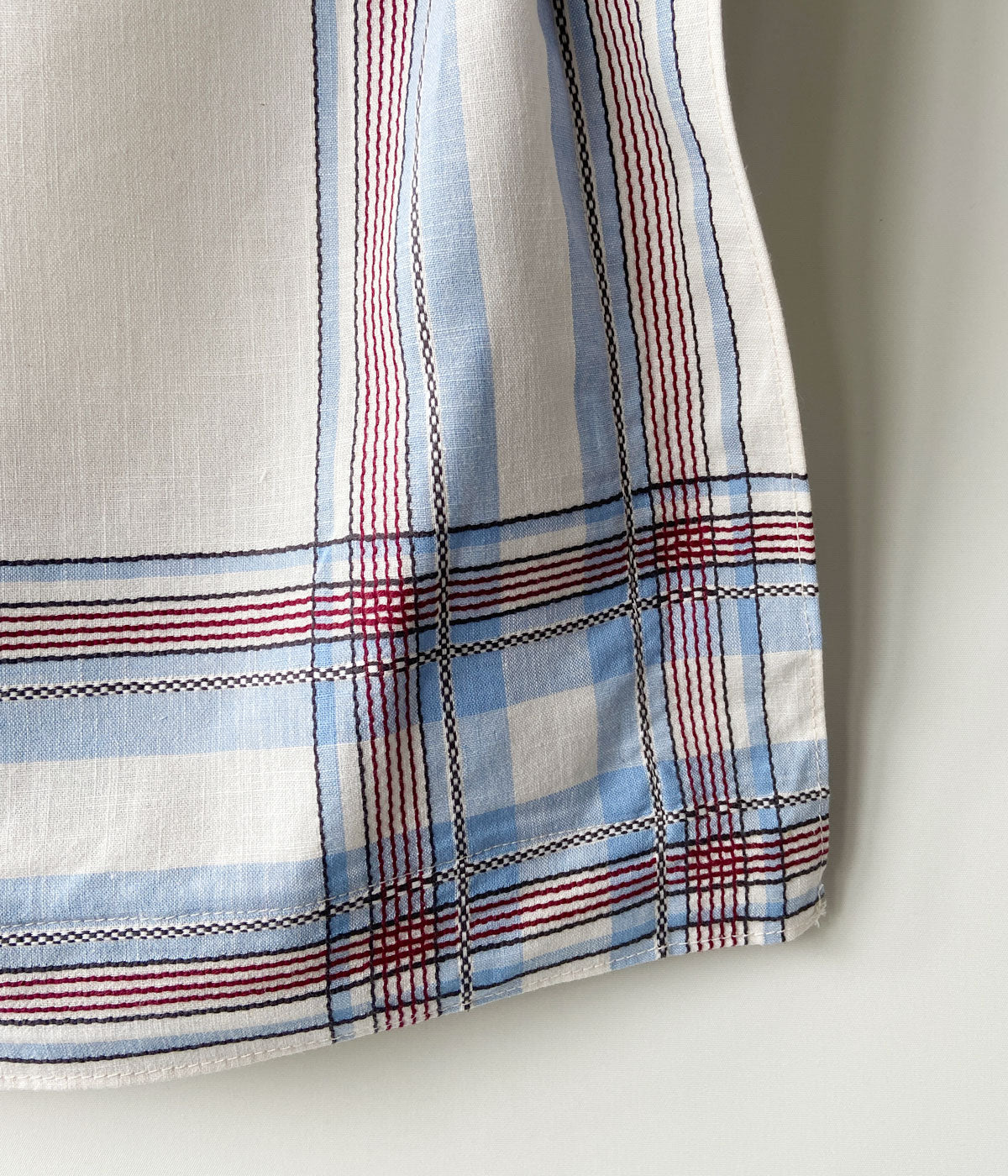 FUMIKA_UCHIDAからHANDKERCHIEF PULLOVER TOPが入荷しました。コットンリネン素材のハンカチ柄ブルオーバートップス。コットンリネンのムラ糸をベースに番手違いの糸を使ったドビー織機でハンカチらしいスクエアーの枠柄を作成。生地にシルケット加工を施し、フラットな生地感に仕上げています。ハンカチの2次元感を纏うデザイン。