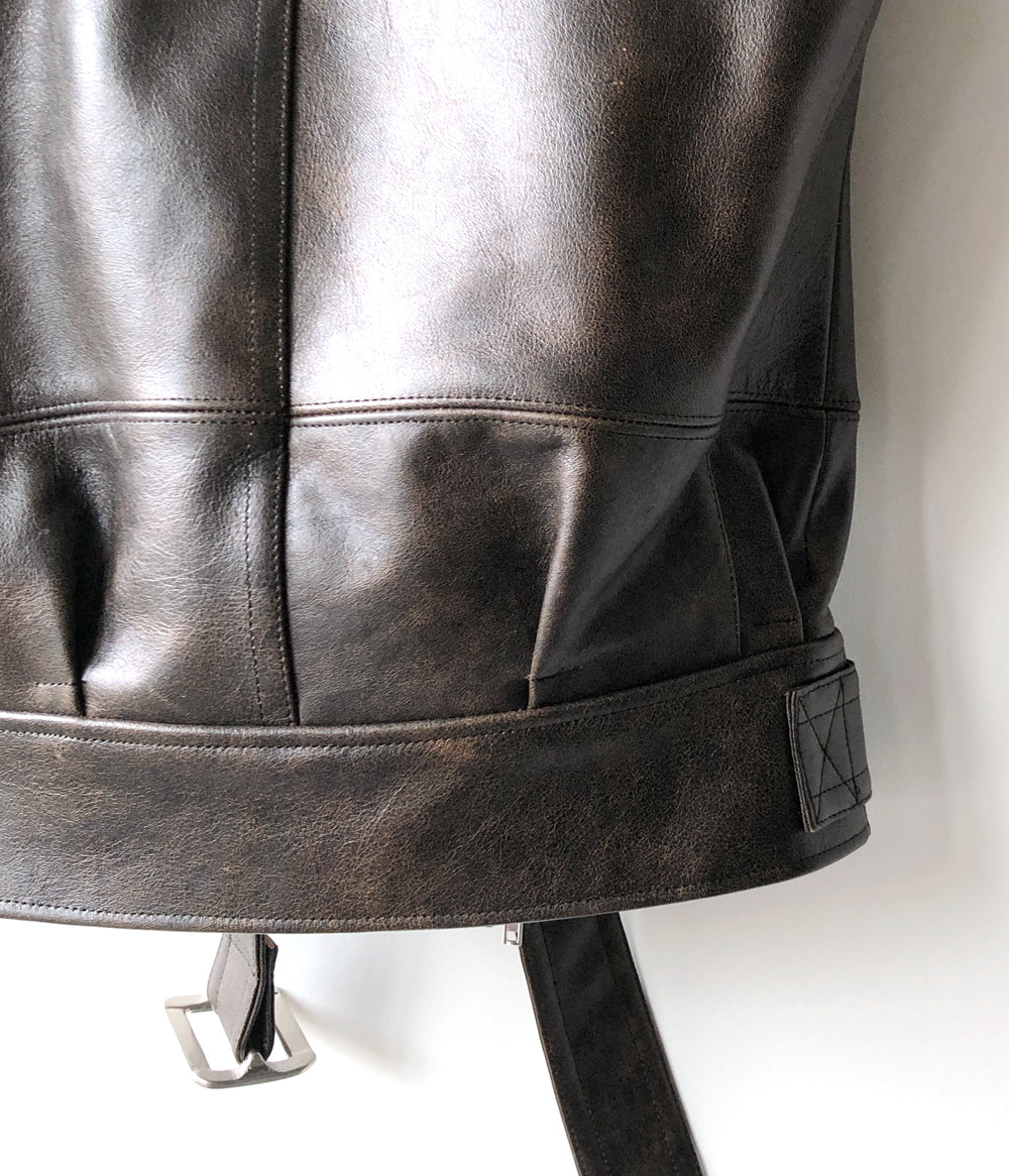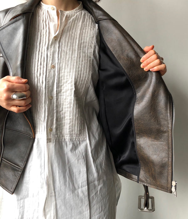 FUMIKA_UCHIDAからLEATHER SLEEVELESS DOUBLE RIDERS JACKETが入荷しました。ベースと表面を配色に染め分け、クラック加工を入れた牛レザーを作成し、使用したスリーブレスライダース。オーバーサイズな肩、身幅のダブル合わせ。前後に膨らみのあるシルエットのヒップ丈。ダブルファスナーでの開閉。着用していくうちにクラック感が強くなりベースの色が出てくる経年変化を楽しめる一着です。