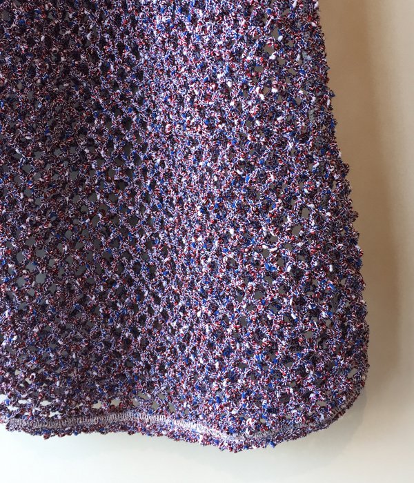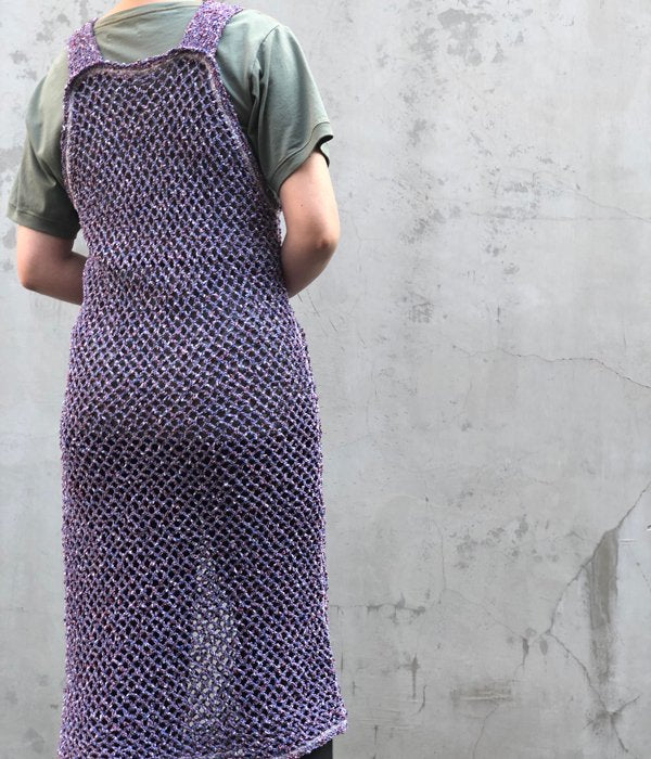 FUMIKA_UCHIDAからMESH NT TANK DRESSが入荷しました。昨年人気のあったメッシュドレスを、ネップ状の3~5色の糸を縒り合せた糸に変更し作製。ツィードの様に見えるメッシュ編み地を、一着一着ハンドのかぎ針で編みたて、トリムはアクセントを出すため、白糸に。