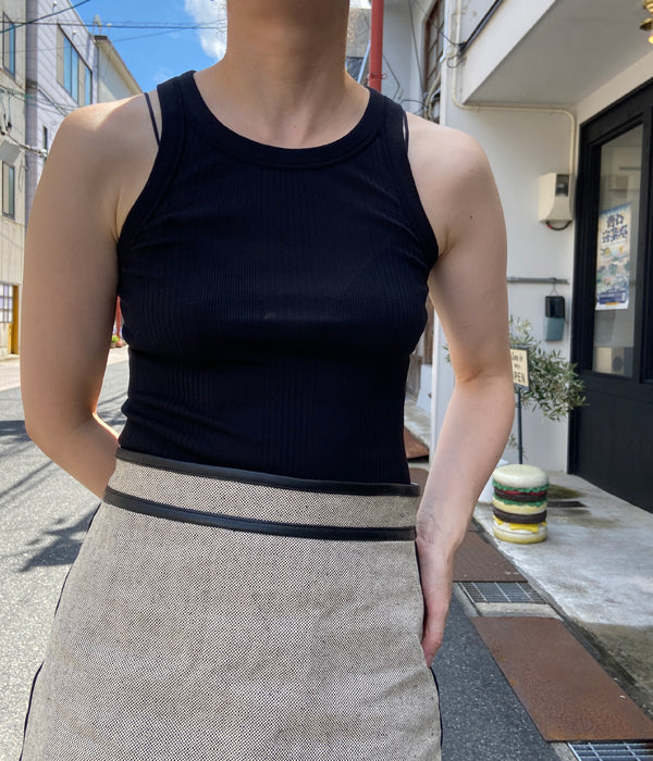 FUMIKA_UCHIDAからNEEDLE DRAWING TANK TOPが入荷しました。22SA, 23SS Spotで使用した針抜きリブ素材のタンクトップを着丈・裾のカッティングをアップデートして作成。通常の編み機に比べ生地のテンションが出やすいドイツ製の編み機を使用することでハリのあるドライな質感と着心地の良い素材に仕上がっています。ボトムスのバランスを選ばないヒッ プまでの着丈。レギュラーアイテムとして提案いただきたいインナーです。
