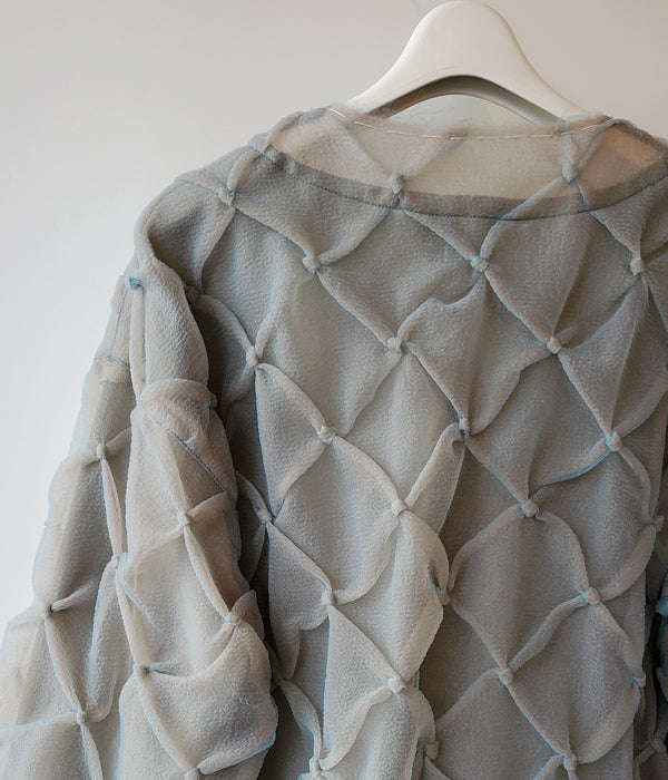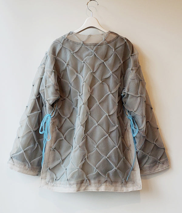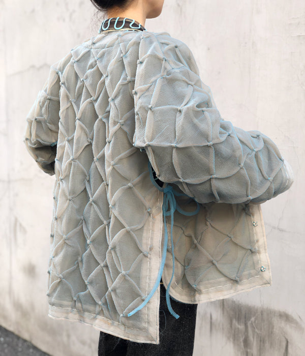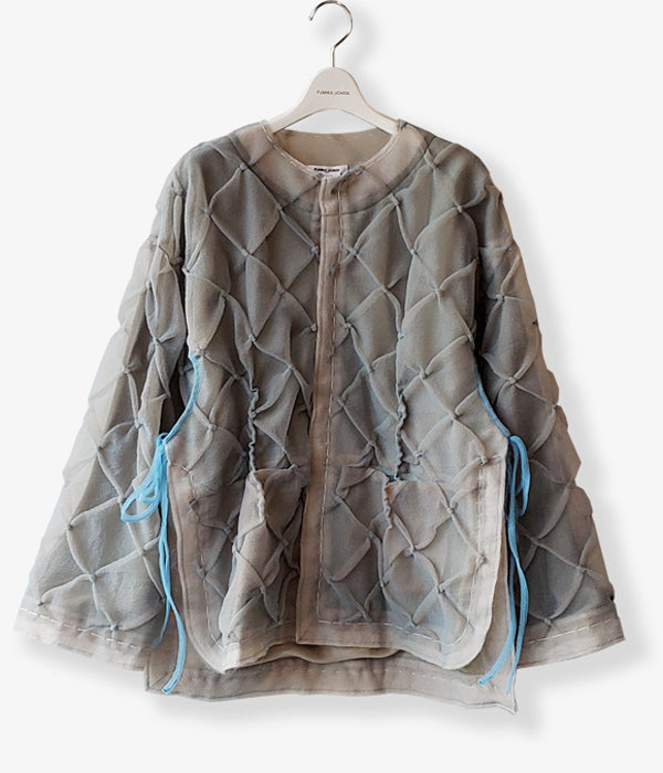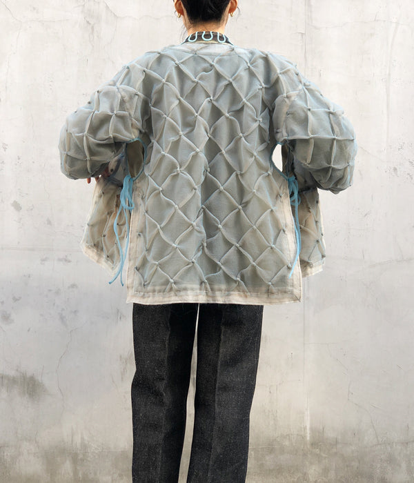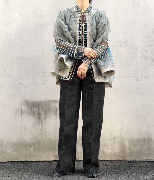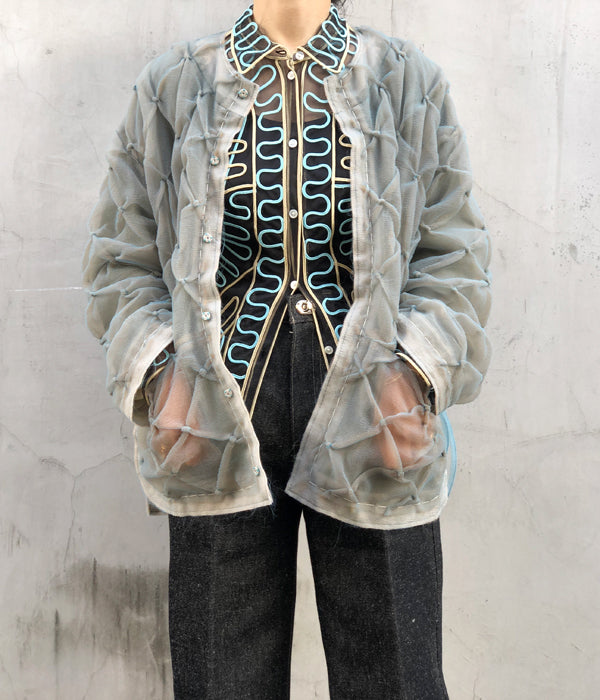 FUMIKA_UCHIDAからNylon Organdie Satin/EMBROIDERED BLOUSONが入荷しました。真逆な2色のオーガンジー生地を手刺繍でドッキングさせて違和感のある色の見え方をする表地と、あえて目ヨレが生じるように作られたブロークンサテンを裏地に使用したブルゾン。オーバーショルダーで太くストレートな袖にゆったりとした身頃のサイドオープンのデザインでアームホール下に付く紐の結び方でアウトラインを形成。断ち切りのエッジをあらわにし、しつけ縫いをそのまま残したようなハンドステッチで未完成なものの繊細な雰囲気を表現。透け感を生かしウール素材の内側にブラウスとして着たり、薄手のブルゾンとして春にも着られる一着です。