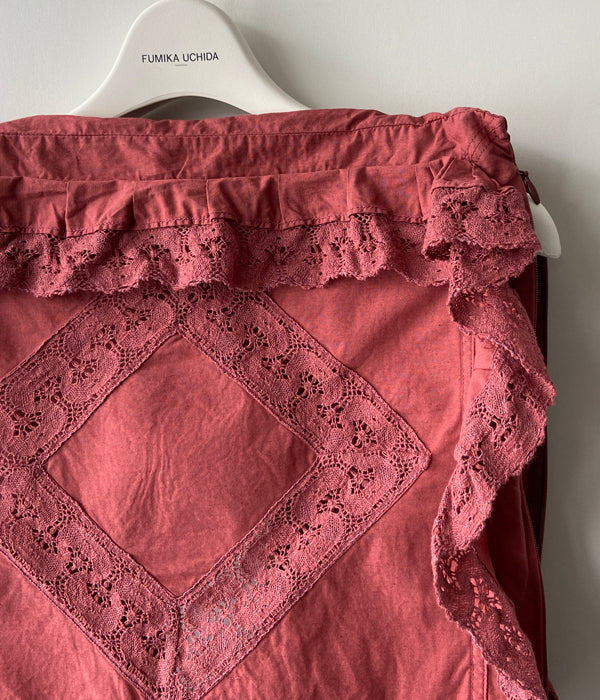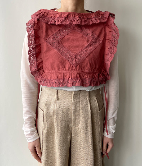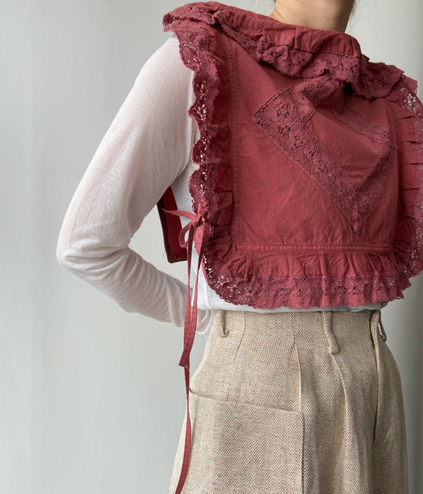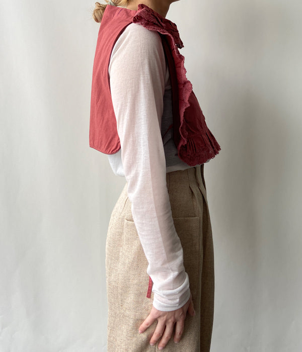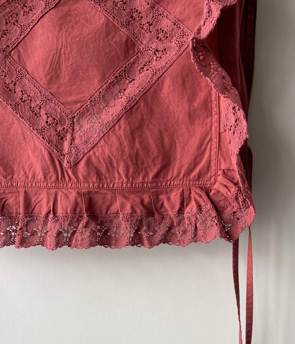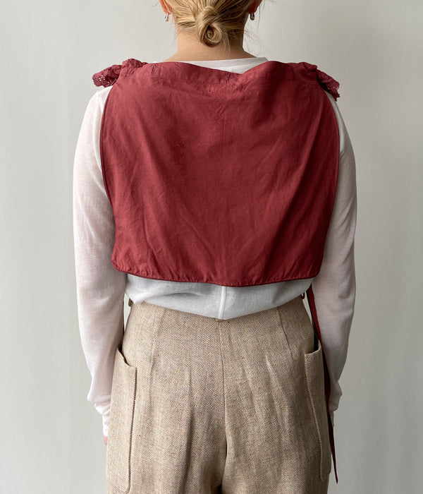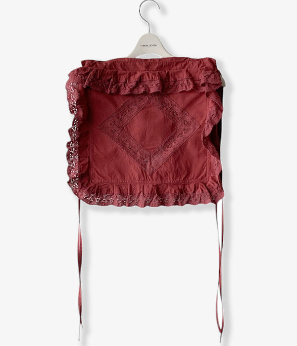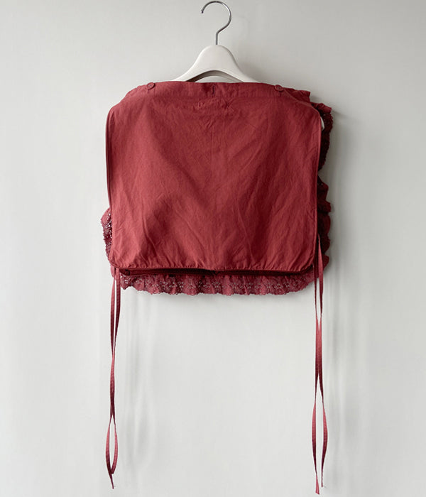 コットンリネン素材とコットンレースを使用したクッションカバーのデザインのトップス。後身共素材のくるみボタンを開けてネック開きを作り、後身のエッジに付くファスナーを開け、内側に付く紐を脇で結んで着用。コンパクトなシルエットのウエスト丈。ファスナーを閉めるとクッションカバーとしても使えるアイテムです。
