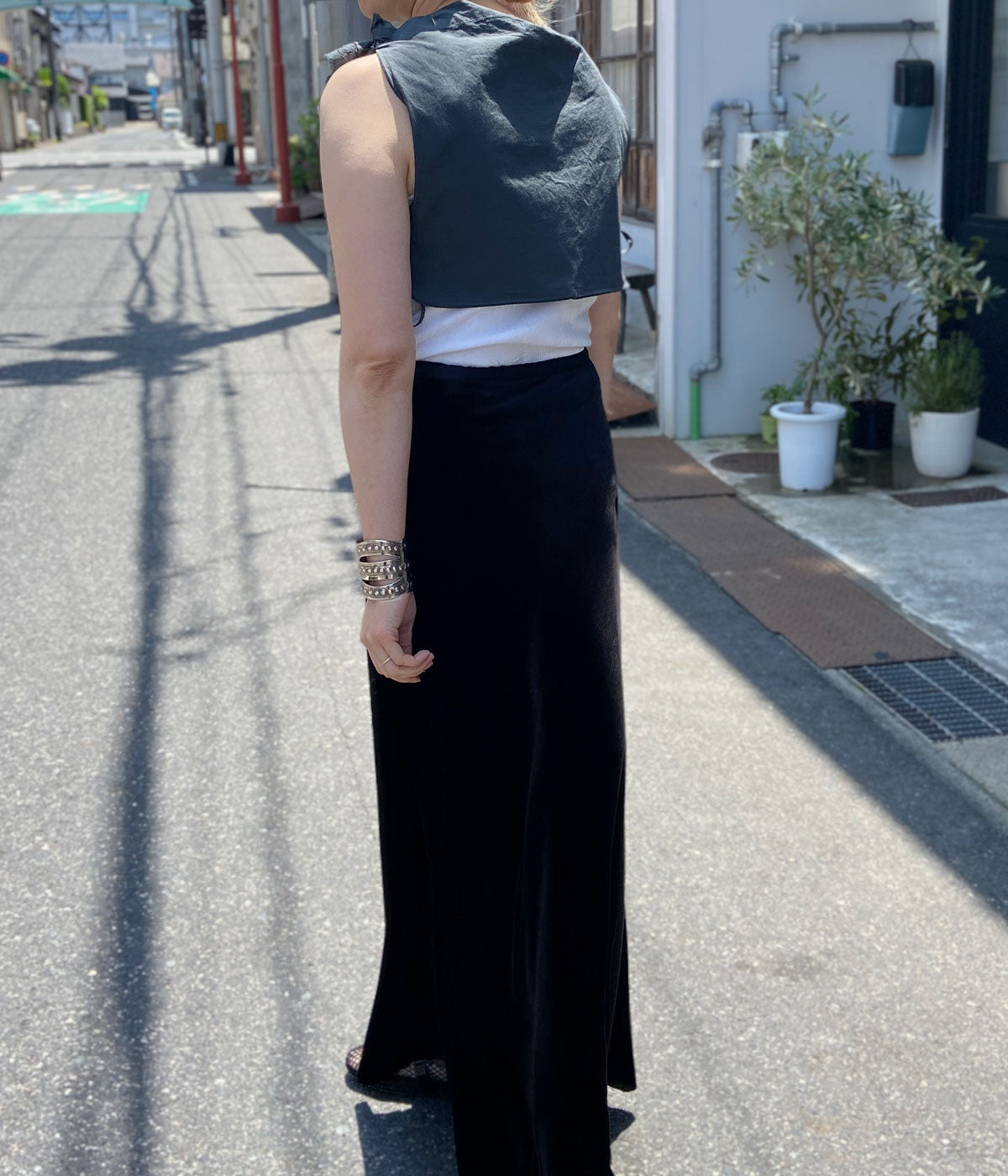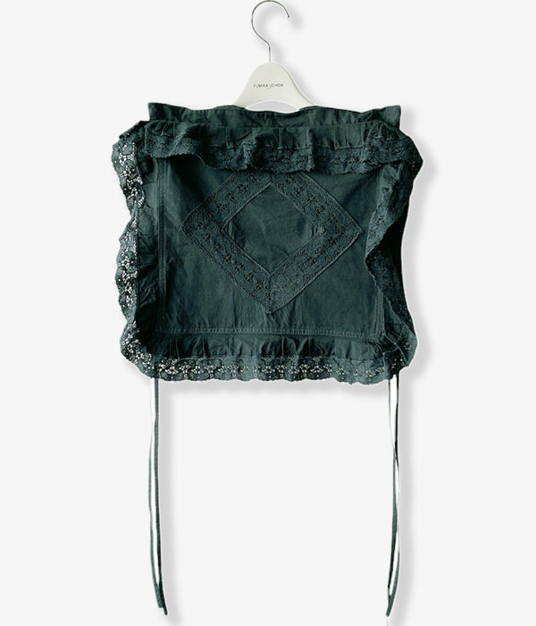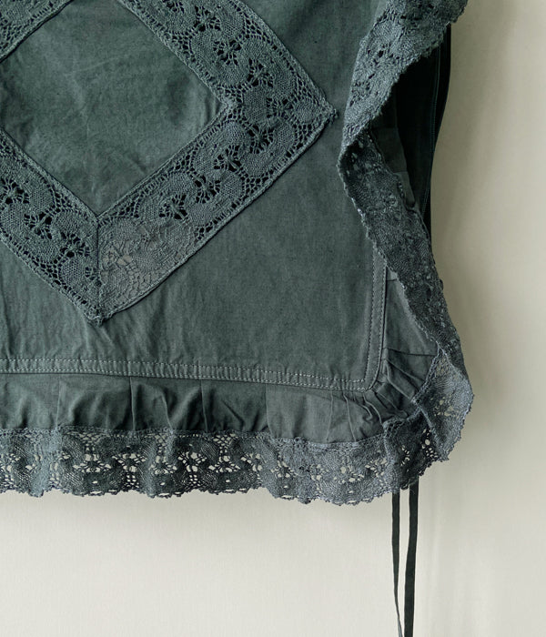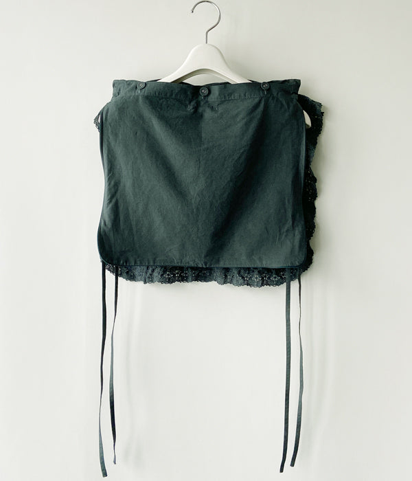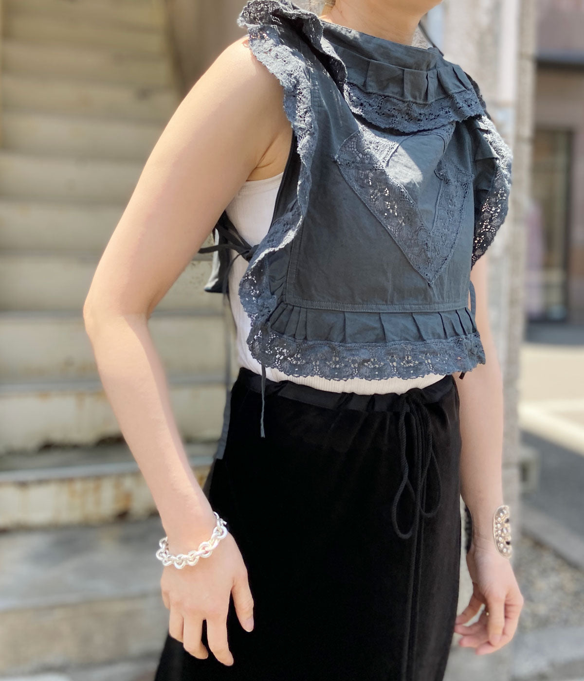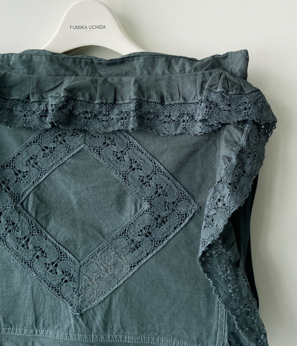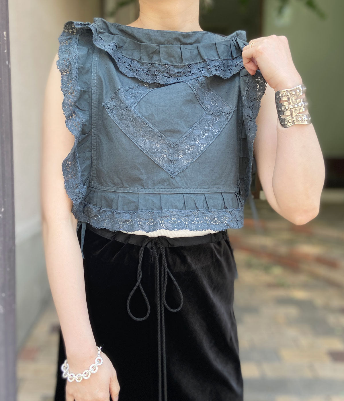 コットンリネン素材とコットンレースを使用したクッションカバーのデザインのトップス。後身共素材のくるみボタンを開けてネック開きを作り、後身のエッジに付くファスナーを開け、内側に付く紐を脇で結んで着用。コンパクトなシルエットのウエスト丈。ファスナーを閉めるとクッションカバーとしても使えるアイテムです。