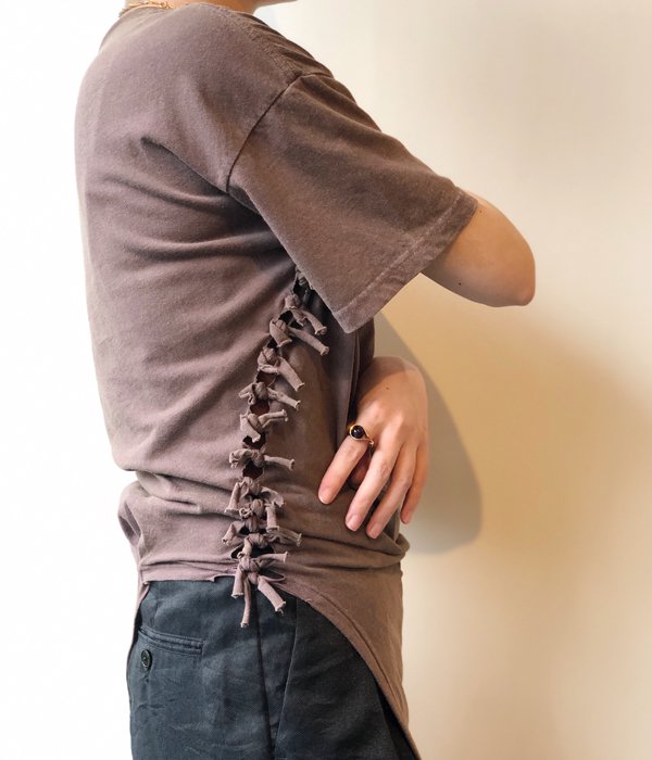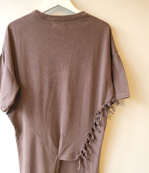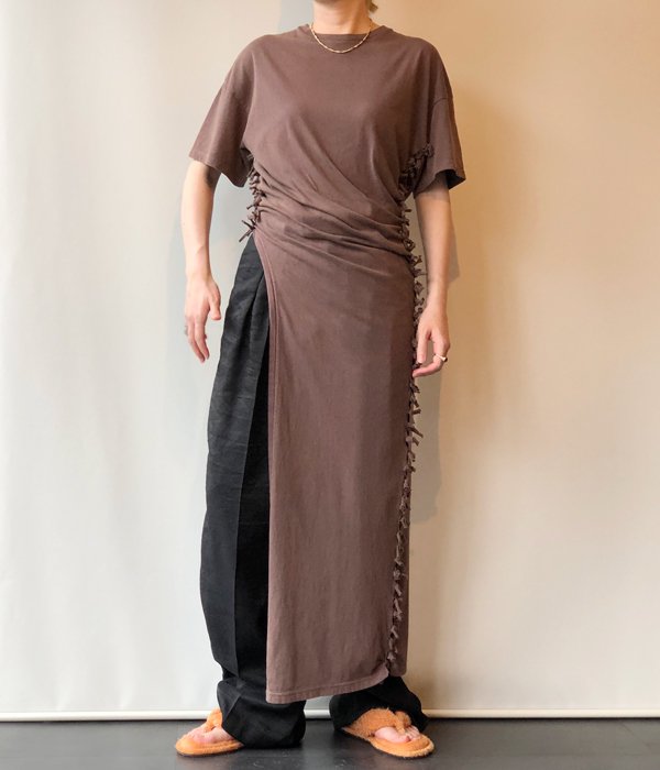 FUMIKA_UCHIDAからOVERDYED SIDE SHIRRING ASYMMETRY DRESSが入荷しました。等間隔に切り込んだ身幅をひとつひとつ手作業で結び、長さの異なる左右の脇に連続するノットがアウトラインを形成するアシンメトリーカットソー。ドライタッチでふっくらとした厚みがありながら軽さのある生地は、製品加工をすることで何色と表現し難い色合いと実験的な雰囲気に。ノットが両脇に来るようにウエストを捻じるようにして体にフィットさせるデザイン。柄物やはっきりとしたカラーのボトムスと合わせて柄や色の分量を変えて楽しみたい一枚です。